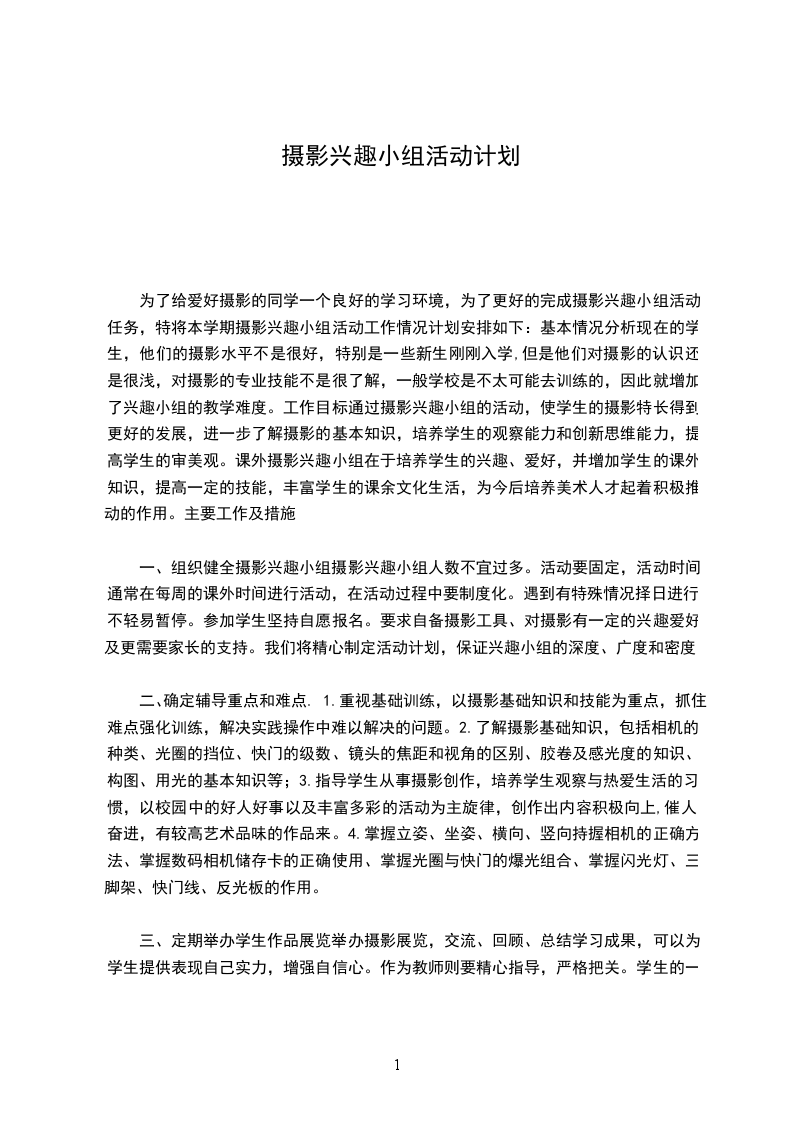 为了给爱好摄影的同学一个良好的学习环境,为了更好的完成摄影兴趣小组活动任务,特将本学期摄影兴趣小组活动工作情况计划安排如下:基本情况分析现在的学生,他们的摄影水平不是很好,特别是一些新生刚刚入学,但是他们对摄影的认识还是很浅,对摄影的专业技能不是很了解,一般学校是不太可能去训练的,因此就增加了兴趣小组的教学难度。工作目标通过摄影兴趣小组的活动,使学生的摄影特长得到更好的发展,进一步了解摄影的基本知识,培养学生的观察能力和创新思维能力,提高学生的审美观。课外摄影兴趣小组在于培养学生的兴趣、爱好,并增加学生的课外知识,提高一定的技能,丰富学生的课余文化生活,为今后培养美术人才起着积极推动的作用。主要工作及措施