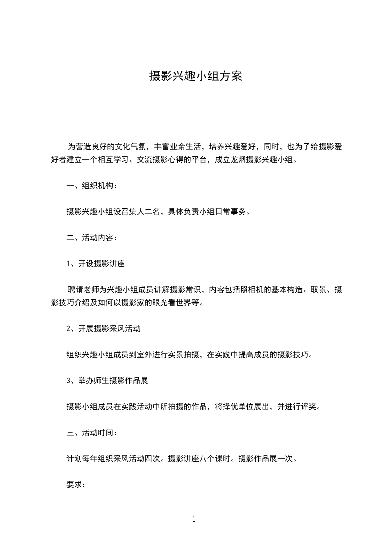 一、组织健全摄影兴趣小组摄影兴趣小组人数不宜过多。活动要固定,活动时间通常在每周的课外时间进行活动,在活动过程中要制度化。遇到有特殊情况择日进行,不轻易暂停。参加学生坚持自愿报名。要求自备摄影工具、对摄影有一定的兴趣爱好及更需要家长的支持。我们将精心制定活动计划,保证兴趣小组的深度、广度和密度。
