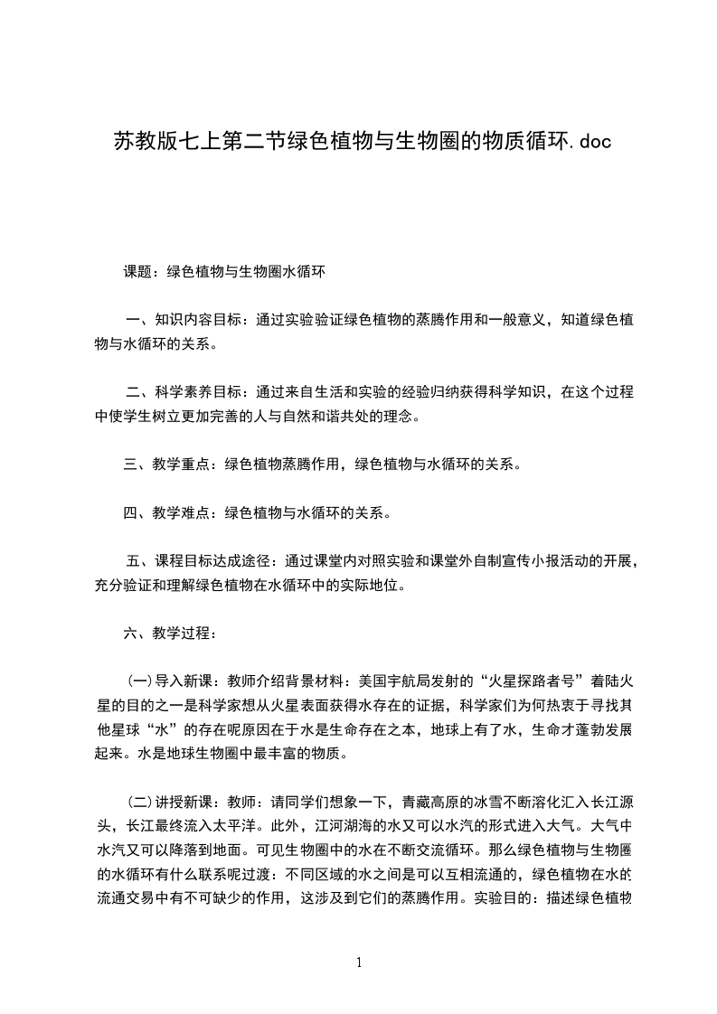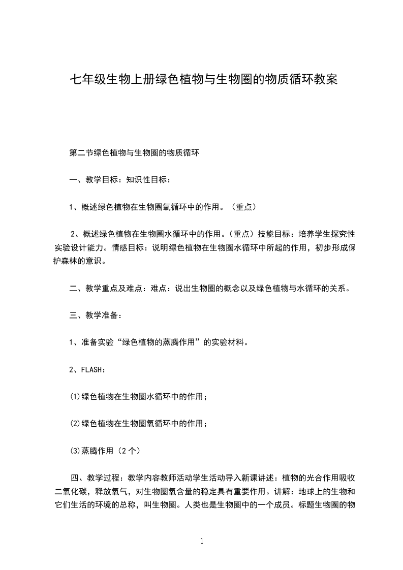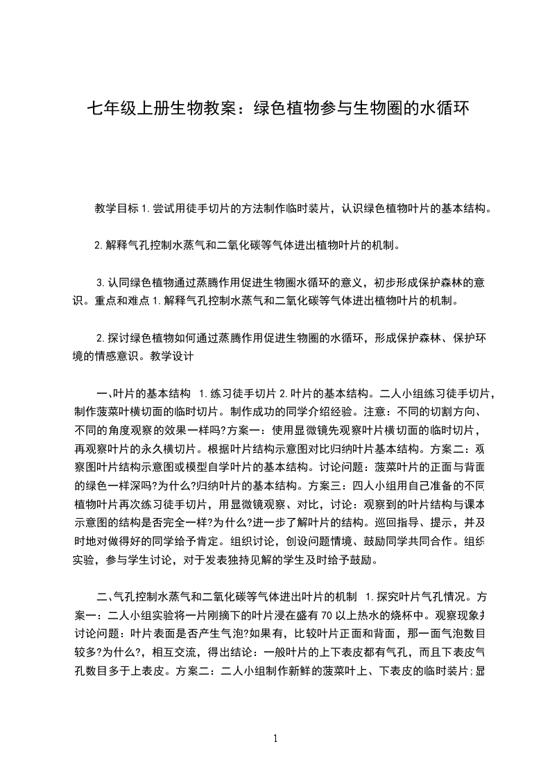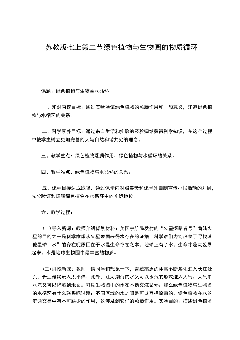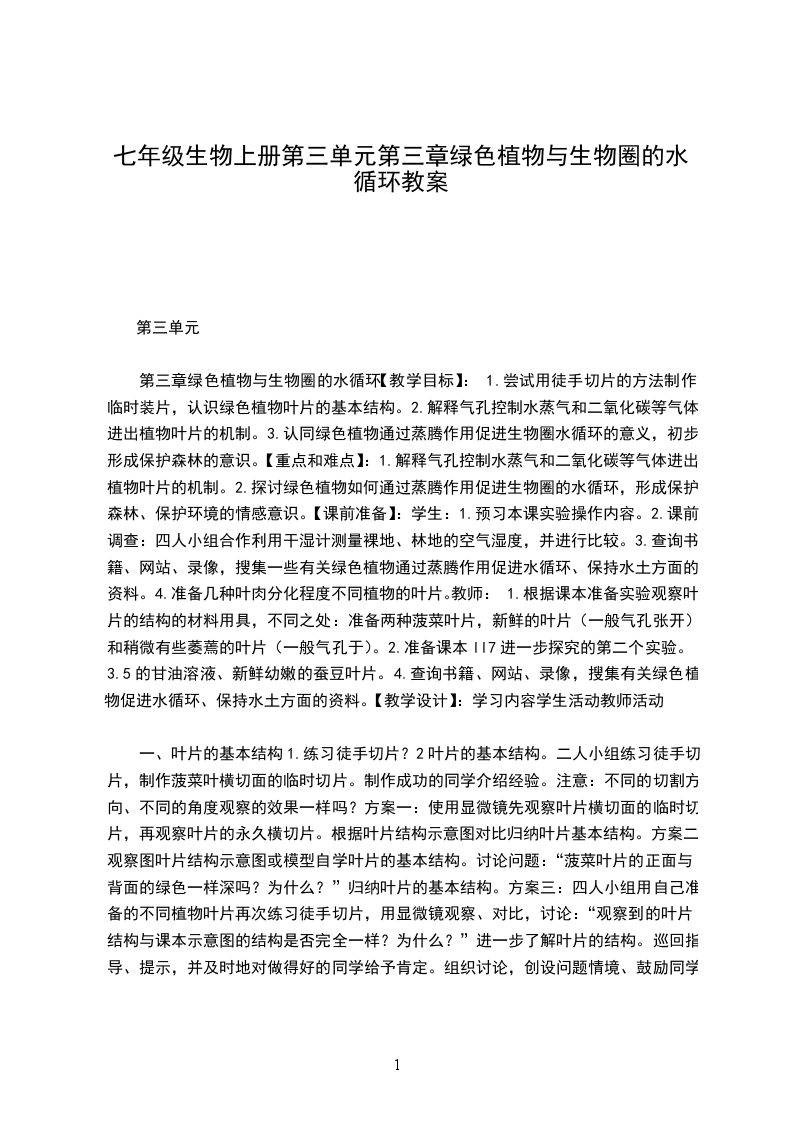 2、初步形成保护森林的意识和探究性实验设计能力。重点难点重点:绿色植物在生物圈水循环中的作用;难点:说出生物圈的概念以及绿色植物与水循环的关系。教法选择自学讨论法课型新授课课前准备