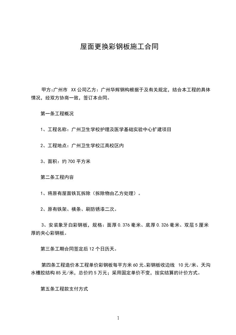 第四条工程造价本工程单价彩钢板每平方米60元、彩钢板收边线10元/米、天沟水槽胶结构85元/米,总价约5万元;采用固定单价不变,按实结算的计价方式。