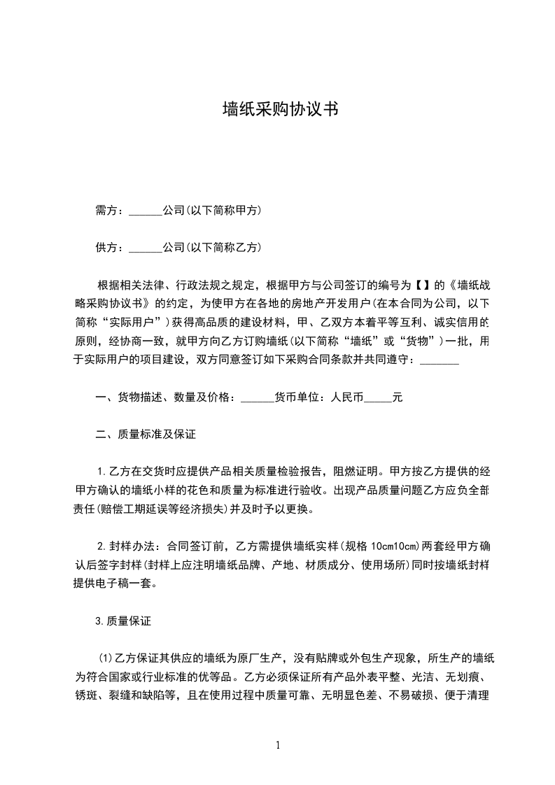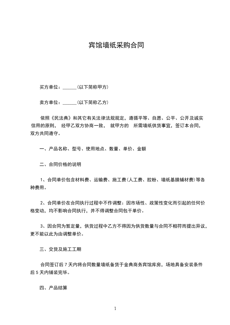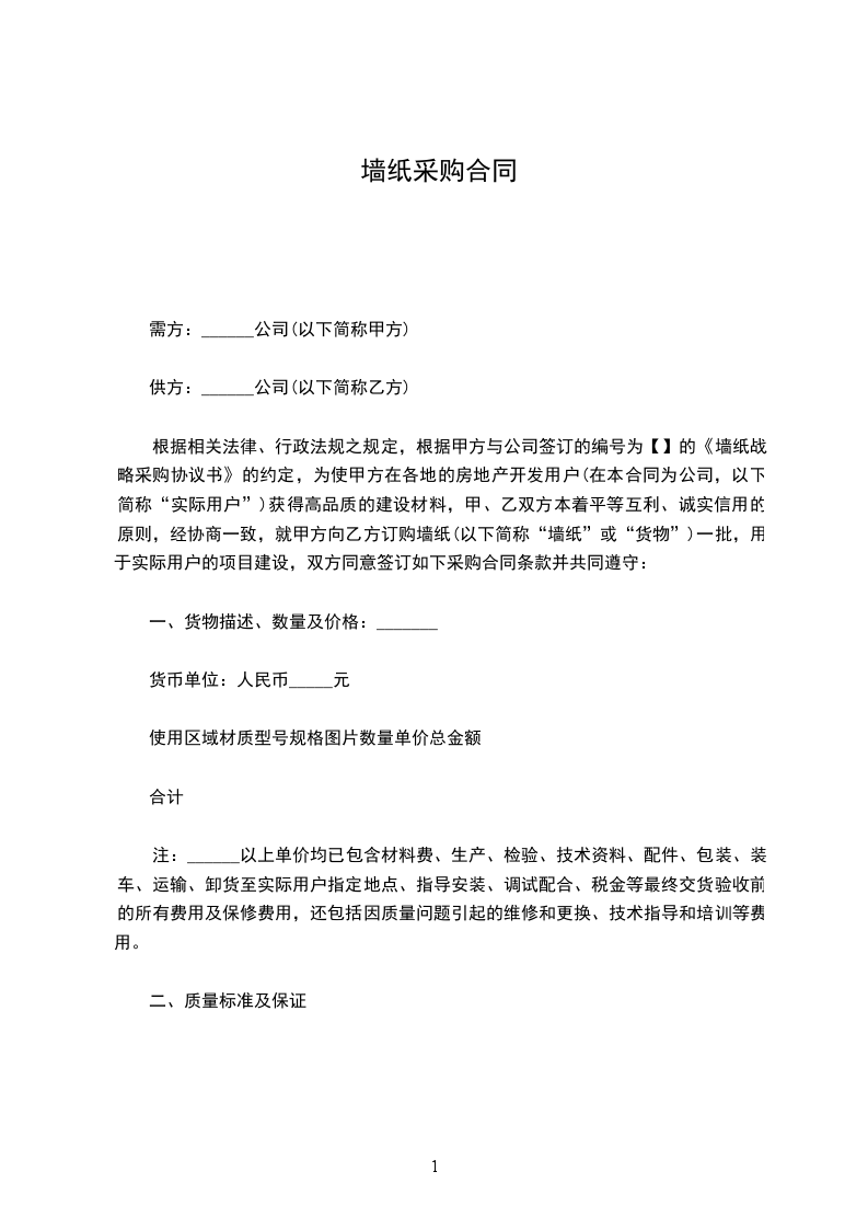 买方单位:(以下简称甲方)卖方单位:(以下简称乙方)依照于和其它有关法律法规规定,遵循平等、自愿、公平、公开及诚实信用的原则,经甲乙双方协商一致,就甲方的所需墙纸供货事宜,签订本合同,双方共同遵守。