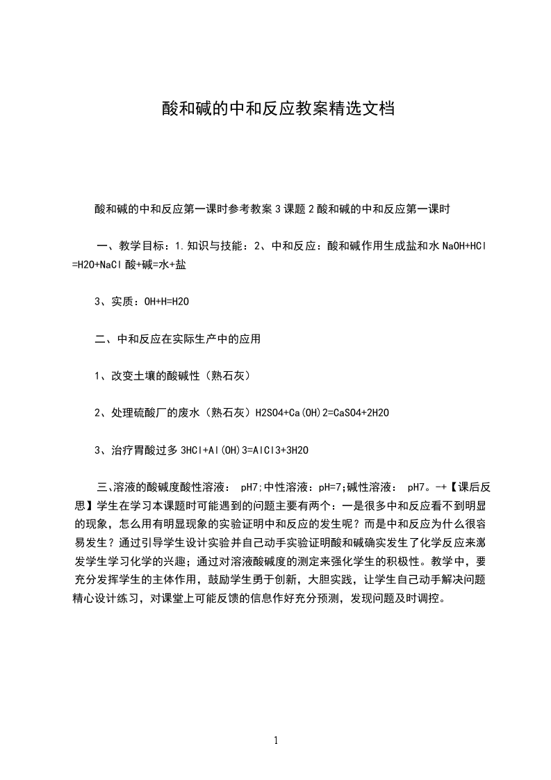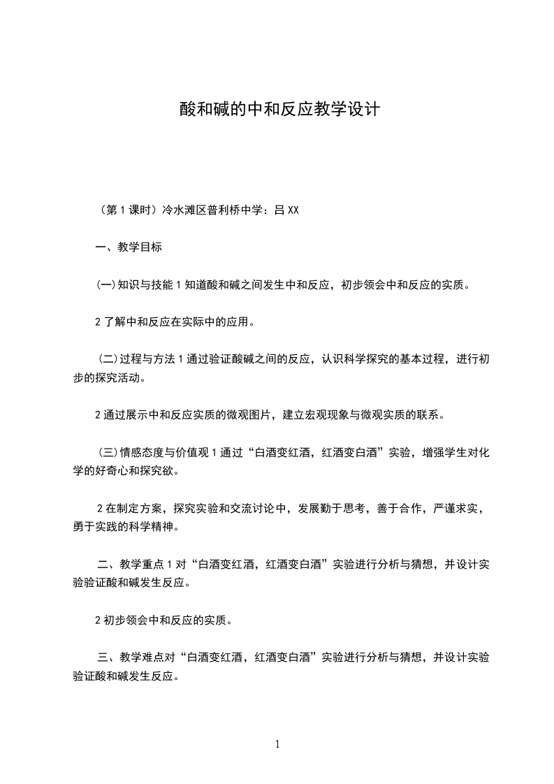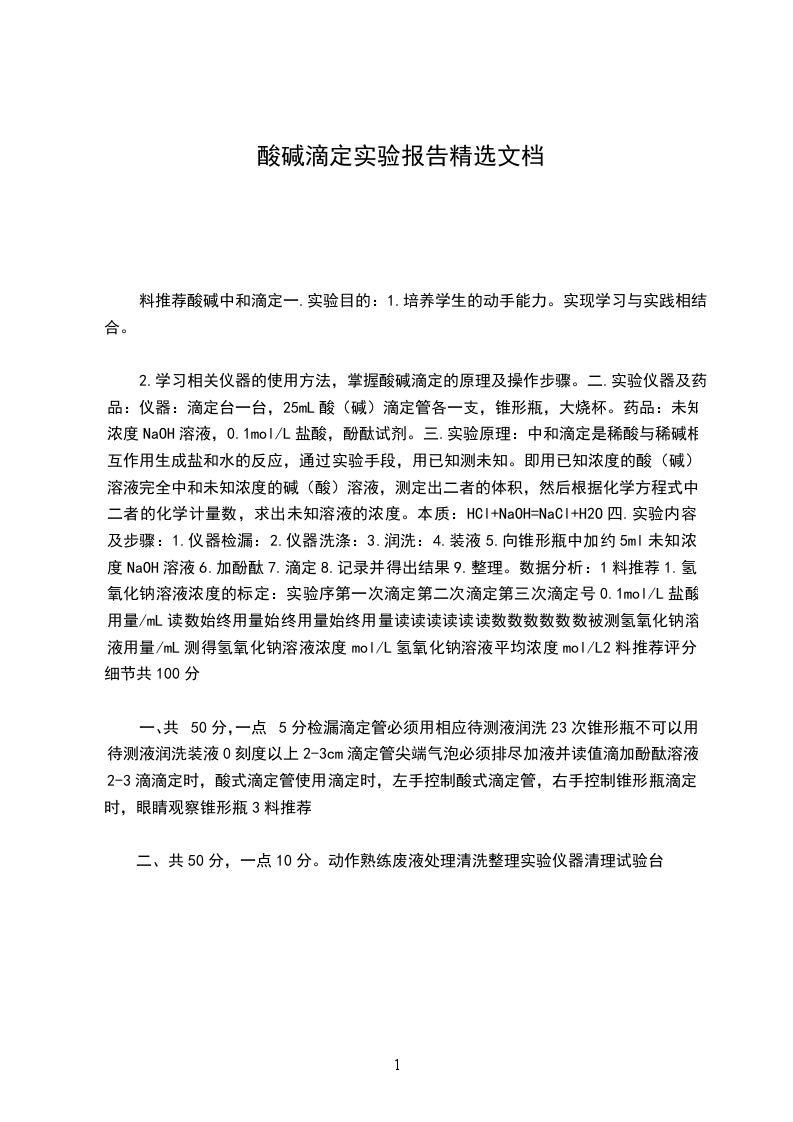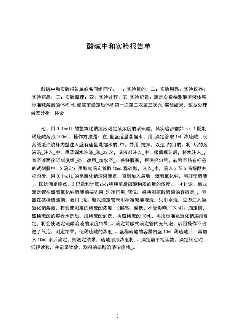 酸碱中和实验报告单姓名同组同学:一:实验目的:二:实验用品:实验仪器:实验药品:三:实验原理:四:实验过程:五.实验纪录:滴定次数待测酸溶液体积标准碱溶液的体积mL滴定前滴定后体积第一次第二次第三次六.实验结果:数据处理:误差分析:体会