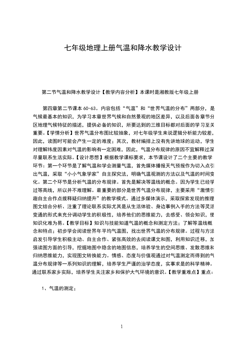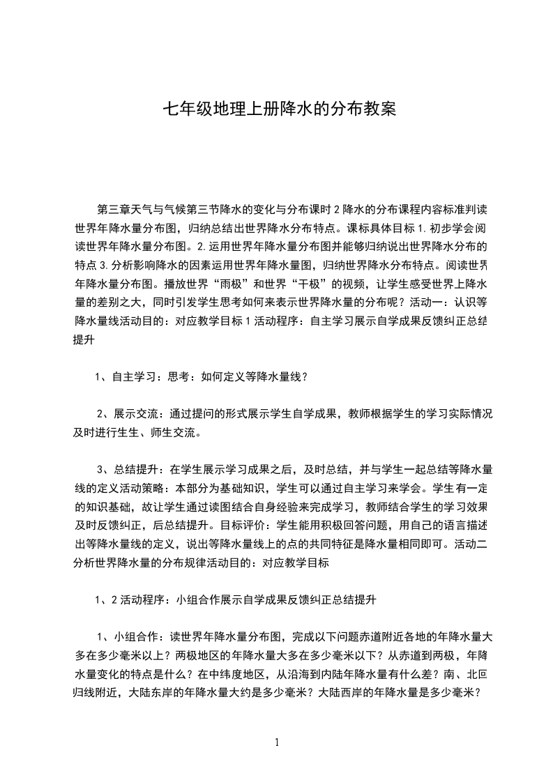 3、总结提升:在学生展示学习成果之后,及时总结,并与学生一起总结世界年水量的分布规律活动策略:本部分知识有一定难度,学生可以通过小组合作交流探究的形式完成学习。学生通过读图结合自身经验来完成学习,教师结合学生的学习效果及时反馈纠正,后总结提升。目标评价:学生能够积极参与小组讨论,发表自己的观点;能用用选取具体地点进行比较的方式归纳出世界降水量的分布规律。活动三:分析影响降水量分布的因素活动目的:对应教学目标3活动程序:自主学习展示自学成果反馈纠正总结提升