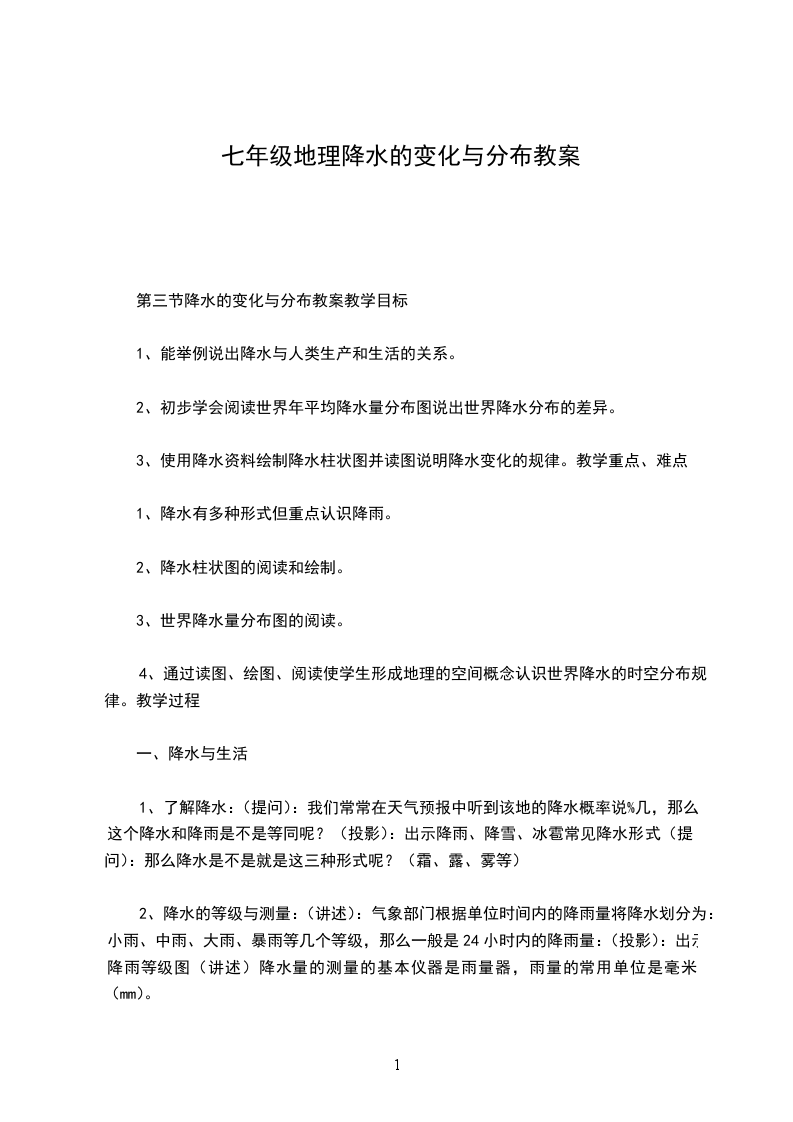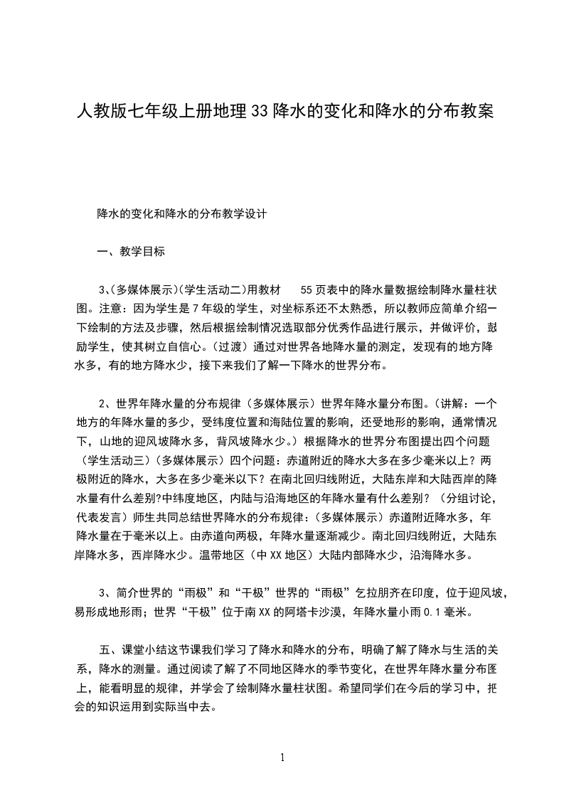 3、总结提升:在学生展示学习成果之后,及时总结,并与学生一起总结等降水量线的定义活动策略:本部分为基础知识,学生可以通过自主学习来学会。学生有一定的知识基础,故让学生通过读图结合自身经验来完成学习,教师结合学生的学习效果及时反馈纠正,后总结提升。目标评价:学生能用积极回答问题,用自己的语言描述出等降水量线的定义,说出等降水量线上的点的共同特征是降水量相同即可。活动二:分析世界降水量的分布规律活动目的:对应教学目标