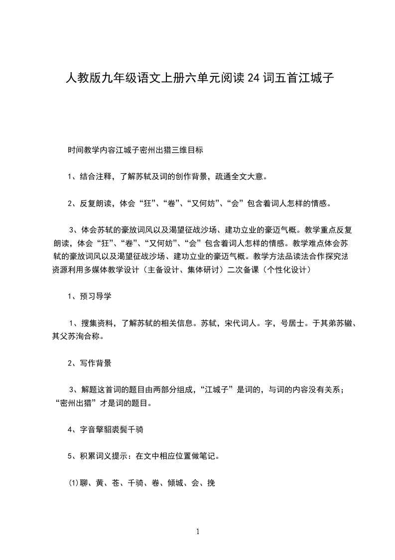 3、体会苏轼的豪放词风以及渴望征战沙场、建功立业的豪迈气概。教学重点反复朗读,体会“狂”、“卷”、“又何妨”、“会”包含着词人怎样的情感。教学难点体会苏轼的豪放词风以及渴望征战沙场、建功立业的豪迈气概。教学方法品读法合作探究法资源利用多媒体教学设计(主备设计、集体研讨)二次备课(个性化设计)