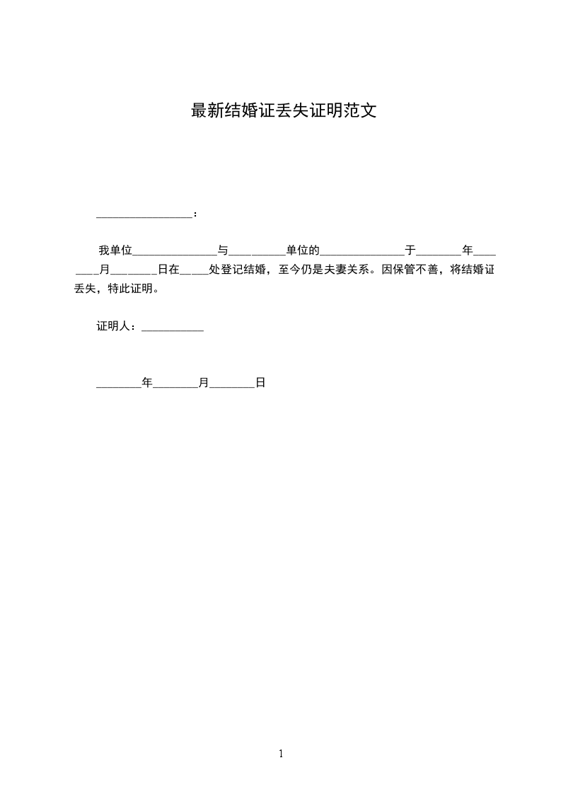 我单位_______________与__________单位的_______________于________年________月________日在_____处登记结婚,至今仍是夫妻关系。因保管不善,将结婚证丢失,特此证明。