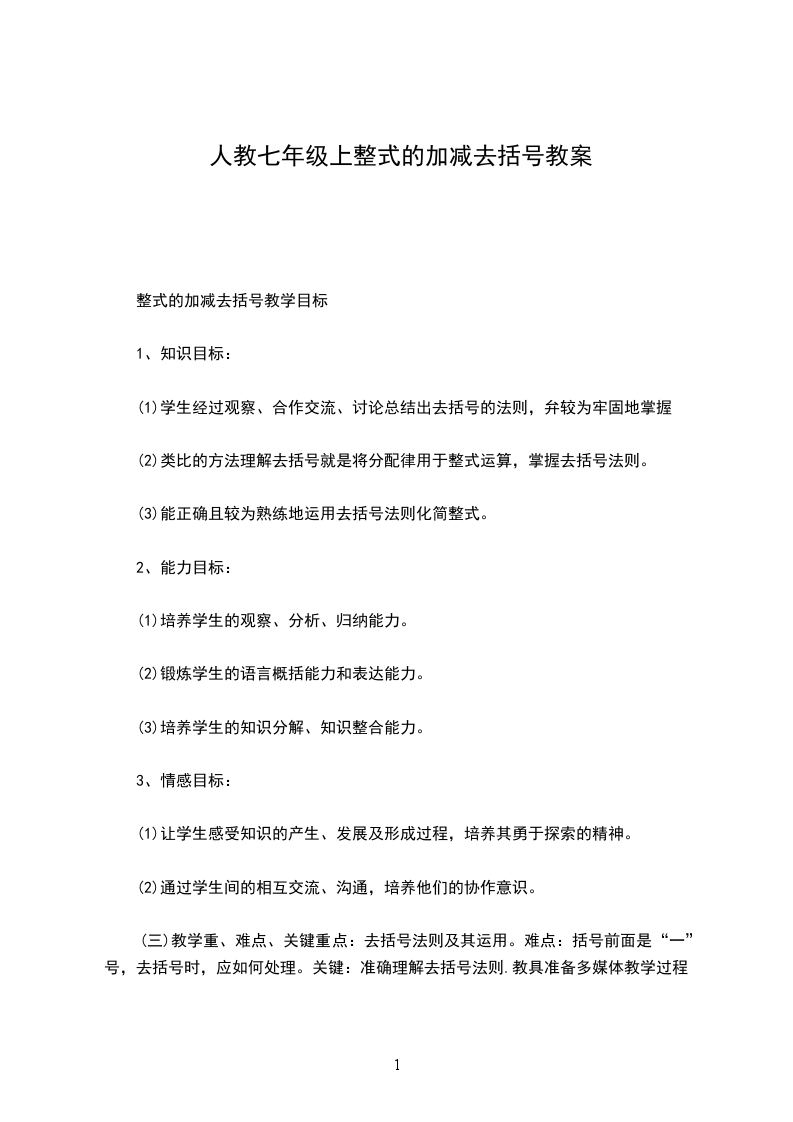 (三)教学重、难点、关键重点:去括号法则及其运用。难点:括号前面是“一”号,去括号时,应如何处理。关键:准确理解去括号法则.教具准备多媒体教学过程