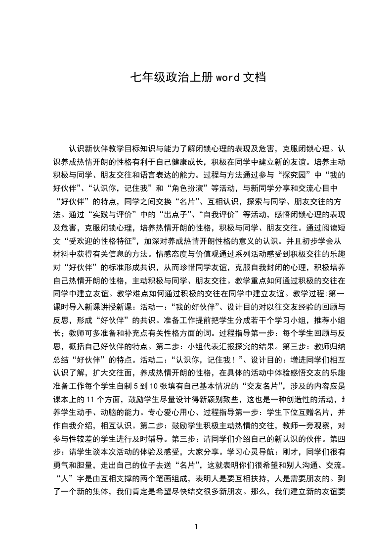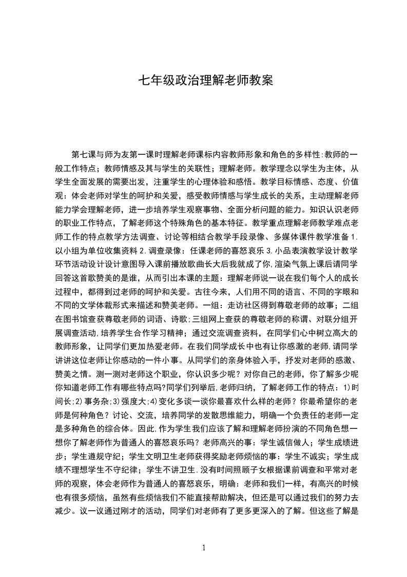 第七课与师为友第一课时理解老师课标内容教师形象和角色的多样性:教师的一般工作特点;教师情感及其与学生的关联性;理解老师。教学理念以学生为主体,从学生全面发展的需要出发,注重学生的心理体验和感悟。教学目标情感、态度、价值观:体会老师对学生的呵护和关爱,感受教师情感与学生成长的关系,主动理解老师。能力学会理解老师,进一步培养学生观察事物、全面分析问题的能力。知识认识老师的职业工作特点,了解老师这个特殊角色的基本特征。教学重点理解老师教学难点老师工作的特点教学方法调查、讨论等相结合教学手段录像、多媒体课件教学准备1.以小组为单位收集资料2.调查录像:任课老师的喜怒哀乐3.小品表演教学设计教学环节活动设计设计意图导入课前播放歌曲长大后我就成了你,渲染气氛上课后请同学回答这首歌赞美的是谁,从而引出本课的主题:理解老师说一说在我们每个人的成长过程中,都得到过老师的呵护和关爱。古往今来,人们用不同的语言、不同的字眼和不同的文学体裁形式来描述和赞美老师。一组:走访社区得到尊敬老师的故事;二组在图书馆查获尊敬老师的词语、诗歌;三组网上查获的尊敬老师的称谓、对联分组开展调查活动,培养学生合作学习精神;通过交流调查资料,在同学们心中树立高大的教师形象,让同学们更加热爱老师。在我们同学成长中也有让你感激的老师,请同学讲讲这位老师让你感动的一件小事。从同学们的亲身体验入手,抒发对老师的感激、赞美之情。测一测对老师这个职业,你认识多少呢?对你自己的老师,你了解多少呢?你知道老师工作有哪些特点吗?同学们列举后,老师归纳,了解老师工作的特点:1)时间长;2)事务杂;3)强度大;4)变化多谈一谈你最喜欢什么样的老师?你最希望你的老师是何种角色?讨论、交流,培养同学的发散思维能力,明确一个负责任的老师一定是多种角色的综合体。因此,作为学生我们应该了解和理解老师扮演的不同角色想一想你了解老师作为普通人的喜怒哀乐吗?老师高兴的事:学生诚信做人;学生成绩进步;学生遵规守纪;学生文明卫生老师获得奖励老师烦恼的事:学生不诚实;学生成绩不理想学生不守纪律;学生不讲卫生.没有时间照顾子女根据课前调查和平常对老师的观察,体会老师作为普通人的喜怒哀乐,明确:老师和我们一样,有高兴的时候,也有很多烦恼,虽然有些烦恼我们不能直接帮助解决,但还是可以通过我们的努力去减少。议一议通过刚才的活动,同学们对老师有了更多更深入的了解。但这些了解是不够的,还需要在了解的基础上去互相理解。“理解”,这个伟大的词常与“万岁”相连,确实是建立良好关系的桥梁。理解他人,可以使自己的情感得到升华。那么,你理解他人吗?你理解你的老师吗?1.老师训斥你的时候你能理解吗?2.老师带病工作时3.老师请你协助工作时4.老师教学中出现错误时5.老师在班级管理中的一些作法小品表演、图片展示后提出相关问题,留适当的时间给学生讨论、交流,培养发散思维能力,教师注意及时点评、引导,使学生能在情景体验中更充分理解老师。做一做无论是人们赞誉中的老师,还是你们亲身感受、体验中的老师,他们都在我们成长中起着不可缺少的重要作用。“让老师多一些快乐,少一些烦恼”,我们可以做什么?_对老师有礼貌_主动关心帮助老师_要正确对待教师的不足_做好与教师的沟通工作同学讨论回答,老师引导归纳,使学生对老师的理解内化为情,外化为行。小结目前,我们班额都比较大,老师的工作也比较多,让教师充分了解每个学生是不现实的。希望同学们主动与教师做好沟通工作,学习中的疑难、生活中的苦恼、教学上的缺憾、甚至师生间的误会,都希望同学们主动、大方、真诚地和教师讲出来,共同求得解决的良策。这是教师们最欢迎的。至于怎样与老师进行交流和有效沟通,有什么方法与技巧呢?这个问题下一节课我们大家在一起来共同探讨。引导学生在了解、理解老师的基础上,学会与老师交流和沟通,从而为建立良好的师生关系打下基础。结束播放好大一棵树(师生同唱)在悠扬的歌声中结束新课在充分理解老师的基础上深化对老师的热爱。教学后记:通过调查、讨论等活动,从人们赞美的教师形象,我体验到的教师形象,我期望的教师形象入手,了解老师工作特点,体会老师喜怒哀乐与学生成长的关系,从多角度、多层次理解老师,深化对老师的热爱,为建立民主、和谐的师生关系打下基础。