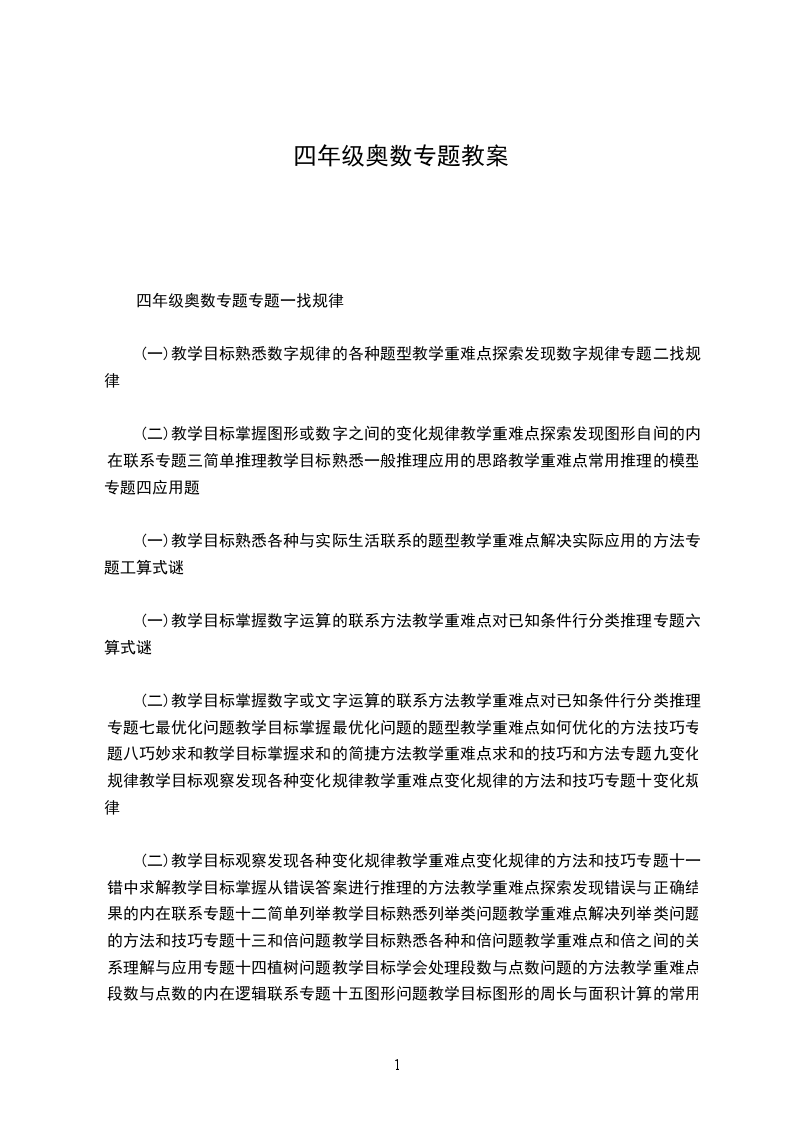 (二)教学目标观察发现各种变化规律教学重难点变化规律的方法和技巧专题十一错中求解教学目标掌握从错误答案进行推理的方法教学重难点探索发现错误与正确结果的内在联系专题十二简单列举教学目标熟悉列举类问题教学重难点解决列举类问题的方法和技巧专题十三和倍问题教学目标熟悉各种和倍问题教学重难点和倍之间的关系理解与应用专题十四植树问题教学目标学会处理段数与点数问题的方法教学重难点段数与点数的内在逻辑联系专题十五图形问题教学目标图形的周长与面积计算的常用方法教学重难点周长的处理,面积拆分专题十六巧妙求和教学目标求和的简捷运算教学重难点求和的运算基本方法理解专题十七数数图形