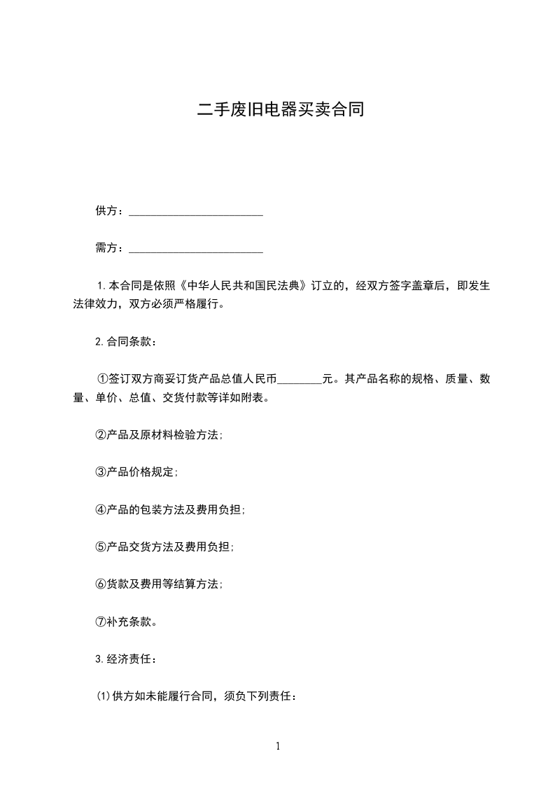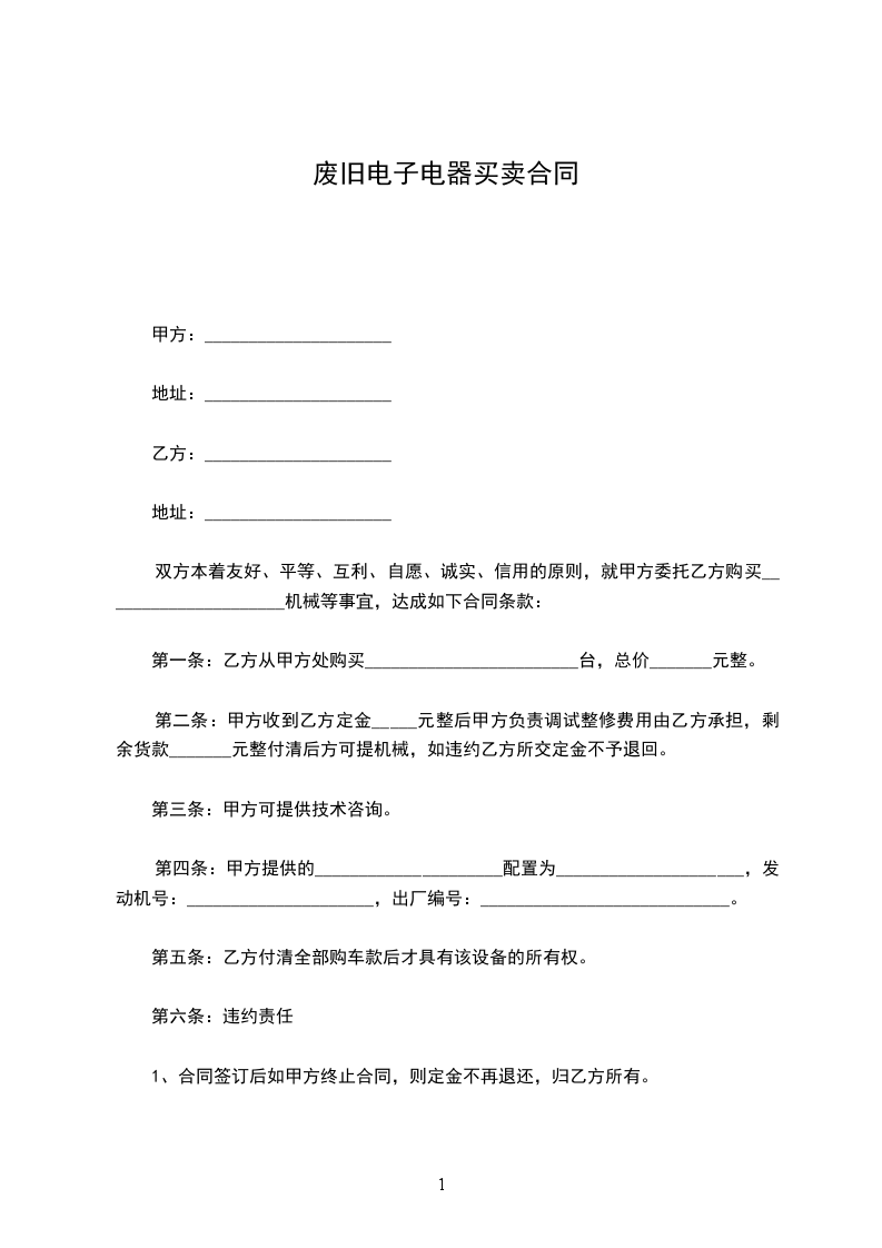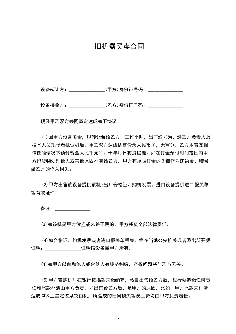 (6)甲方在自己的场地上负责将该机设备安全装上乙方的运输车上。保证乙方顺利离开,乙方将一次性付清余款,该机产权属乙方所有。