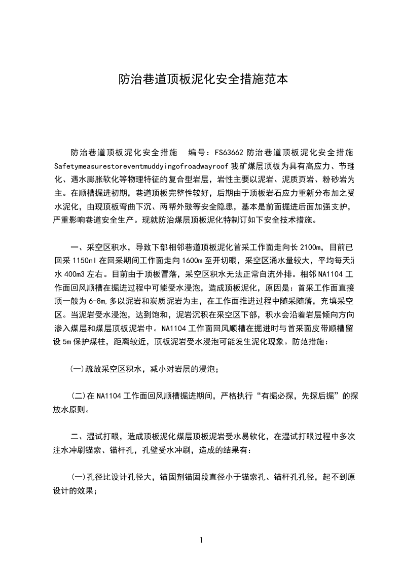 防治巷道顶板泥化安全措施 编号:FS63662防治巷道顶板泥化安全措施Safetymeasurestoreventmuddyingofroadwayroof我矿煤层顶板为具有高应力、节理化、遇水膨胀软化等物理特征的复合型岩层,岩性主要以泥岩、泥质页岩、粉砂岩为主。在顺槽掘进初期,巷道顶板完整性较好,后期由于顶板岩石应力重新分布加之受水泥化,由现顶板弯曲下沉、两帮外豉等安全隐患,基本是前面掘进后面加强支护,严重影响巷道安全生产。现就防治煤层顶板泥化特制订如下安全技术措施。
