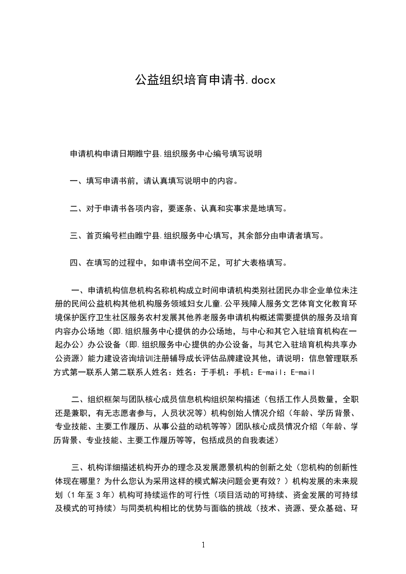 一、申请机构信息机构名称机构成立时间申请机构类别社团民办非企业单位未注册的民间公益机构其他机构服务领域妇女儿童.公平残障人服务文艺体育文化教育环境保护医疗卫生社区服务农村发展其他养老服务申请机构概述需要提供的服务及培育内容办公场地(即.组织服务中心提供的办公场地,与中心和其它入驻培育机构在一起办公)办公设备(即.组织服务中心提供的办公设备,与其它入驻培育机构共享办公资源)能力建设咨询培训注册辅导成长评估品牌建设其他,请说明:信息管理联系方式第一联系人第二联系人姓名:姓名:于手机:手机:E-mail:E-mail
