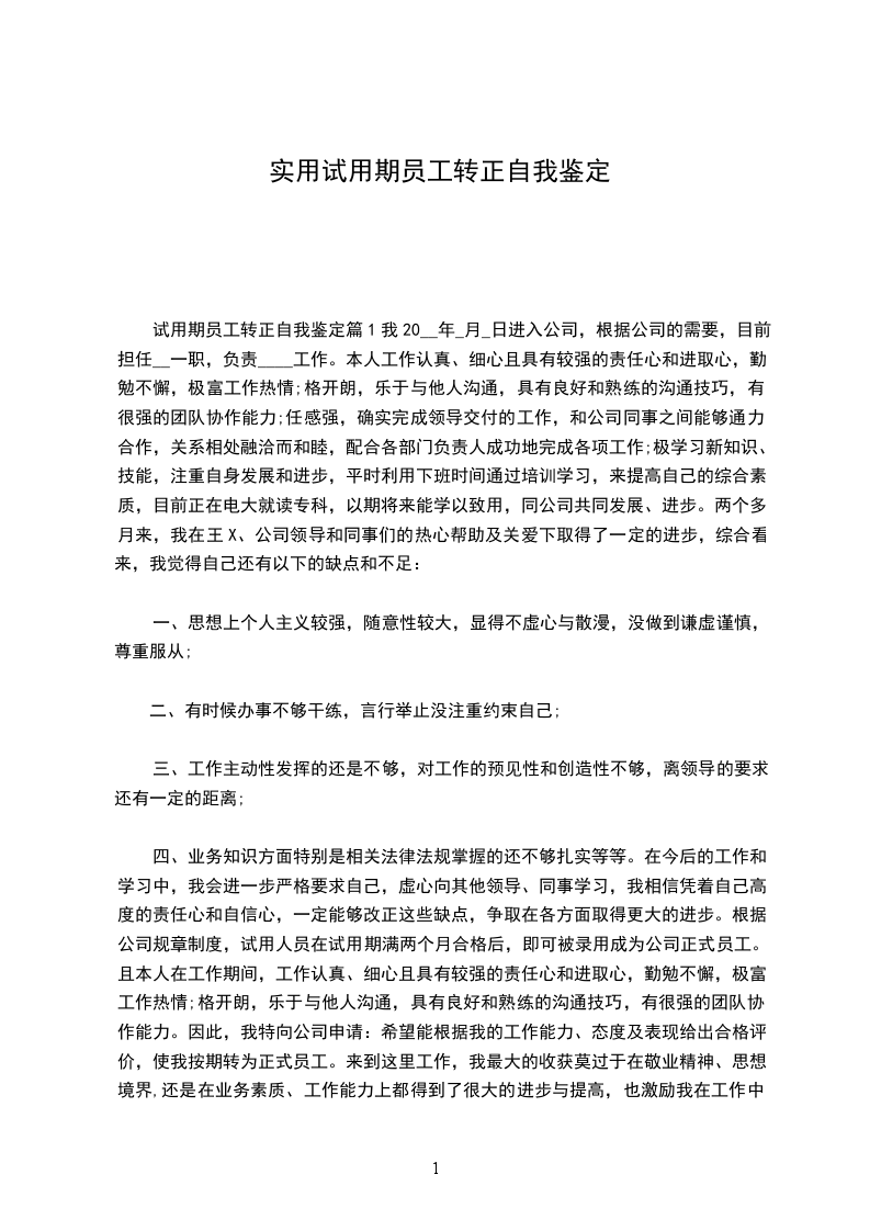 试用期员工转正自我鉴定篇1我20__年_月_日进入公司,根据公司的需要,目前担任__一职,负责____工作。本人工作认真、细心且具有较强的责任心和进取心,勤勉不懈,极富工作热情;格开朗,乐于与他人沟通,具有良好和熟练的沟通技巧,有很强的团队协作能力;任感强,确实完成领导交付的工作,和公司同事之间能够通力合作,关系相处融洽而和睦,配合各部门负责人成功地完成各项工作;极学习新知识、技能,注重自身发展和进步,平时利用下班时间通过培训学习,来提高自己的综合素质,目前正在电大就读专科,以期将来能学以致用,同公司共同发展、进步。两个多月来,我在王X、公司领导和同事们的热心帮助及关爱下取得了一定的进步,综合看来,我觉得自己还有以下的缺点和不足: