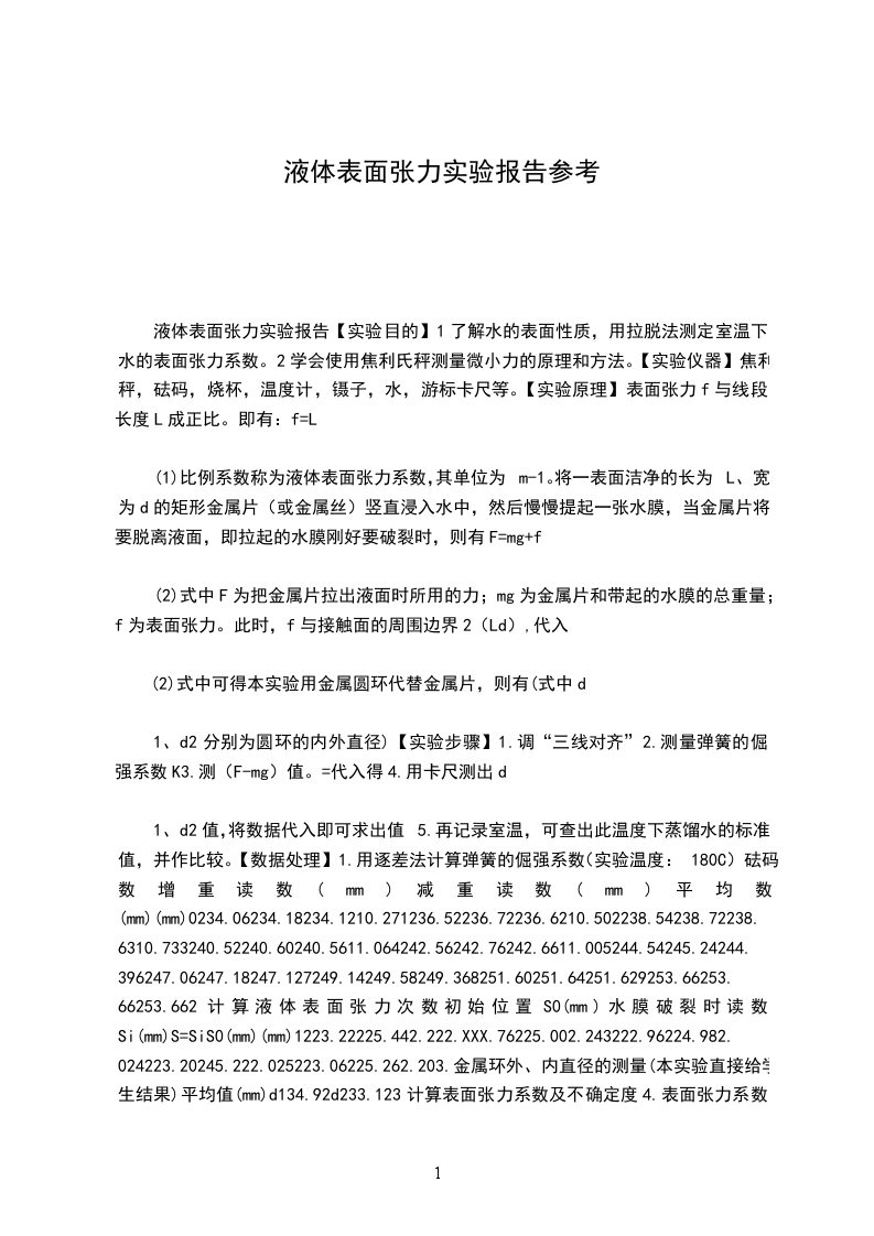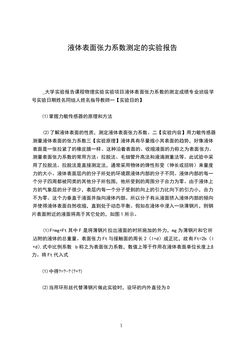 (2)式在欲脱离水膜而又恰未脱离的极限状态时成立,应该保证金属圆环水平拉出水面4本实验中为何安排测(Fmg),而不是分别测F和mg?答:因为直接测F比较麻烦,而且F改变得较小,可能需要力传感器,实现起来不方便也不简单。5.本实验影响测量的主要因素有哪些?这些因素使偏大还是偏小?答:实验表明,与液体种类、纯度、温度和液面上方的气体成分有关,液体温度越高a值越小,液体含杂质越多,值越小,只要上述条件保持一定,则是一个常数原始数据: