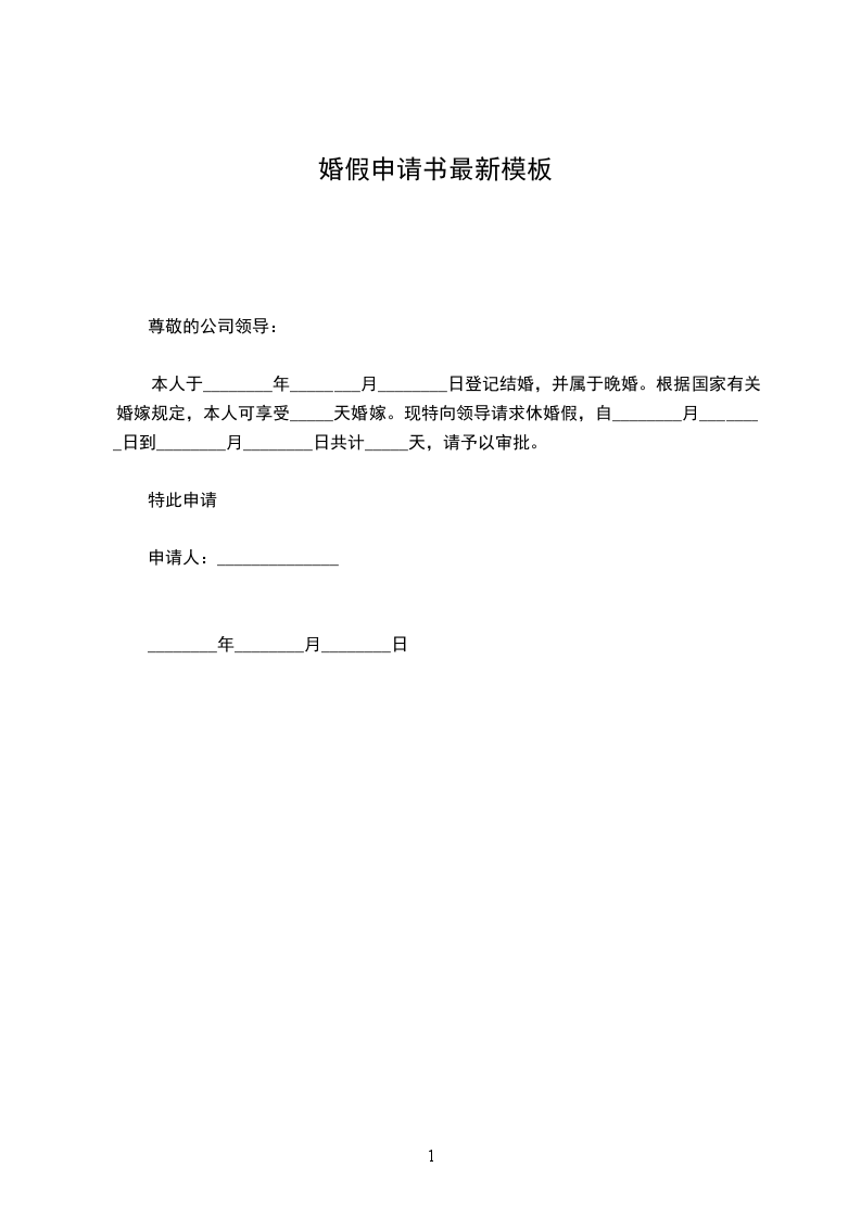 本人于________年________月________日登记结婚,并属于晚婚。根据国家有关婚嫁规定,本人可享受_____天婚嫁。现特向领导请求休婚假,自________月________日到________月________日共计_____天,请予以审批。