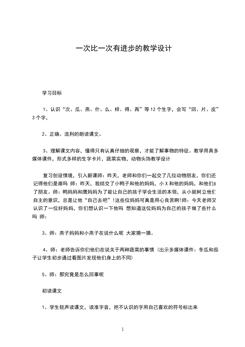 3、收集蔬菜、水果的图片,说说它们的特点。教学反思一次比一次有进步是一篇童话故事。小XX真是一个好孩子,在燕子妈妈的耐心启发下,它观察的一次比一次认真细仔细,每次都有新的发现。终于了解了冬瓜和茄子的不同特点:冬瓜大,茄子小;冬瓜是绿的,茄子是紫的;冬瓜的皮上有细毛,茄子的柄上有小刺。这篇童话将“只有认真观察,才能了解事物的特点”这一道理渗透在课文的字里行间。这篇文章浅显易懂,我指导学生用读一读,标一标,圈一圈,画一画等方法来读懂课文,了解课文隐含的道理。分角色朗读更是加深了对文章的理解。在找出小XX的三次发现后,我对同学们说:“小XX经过三次仔细观察,发现了冬瓜与茄子的不同点。老师相信你们比小XX更认真、更仔细。请仔细观察,你还发现冬瓜与茄子还有什么不一样的地方?”同学们的发现出乎我的意料啊,大家纷纷说:“冬瓜的花是黄的,茄子的花是紫的”“冬瓜的叶子象手掌,茄子的叶子比较长”“在吃冬瓜的时候要把里面的瓤取出来,而茄子可以整吃”