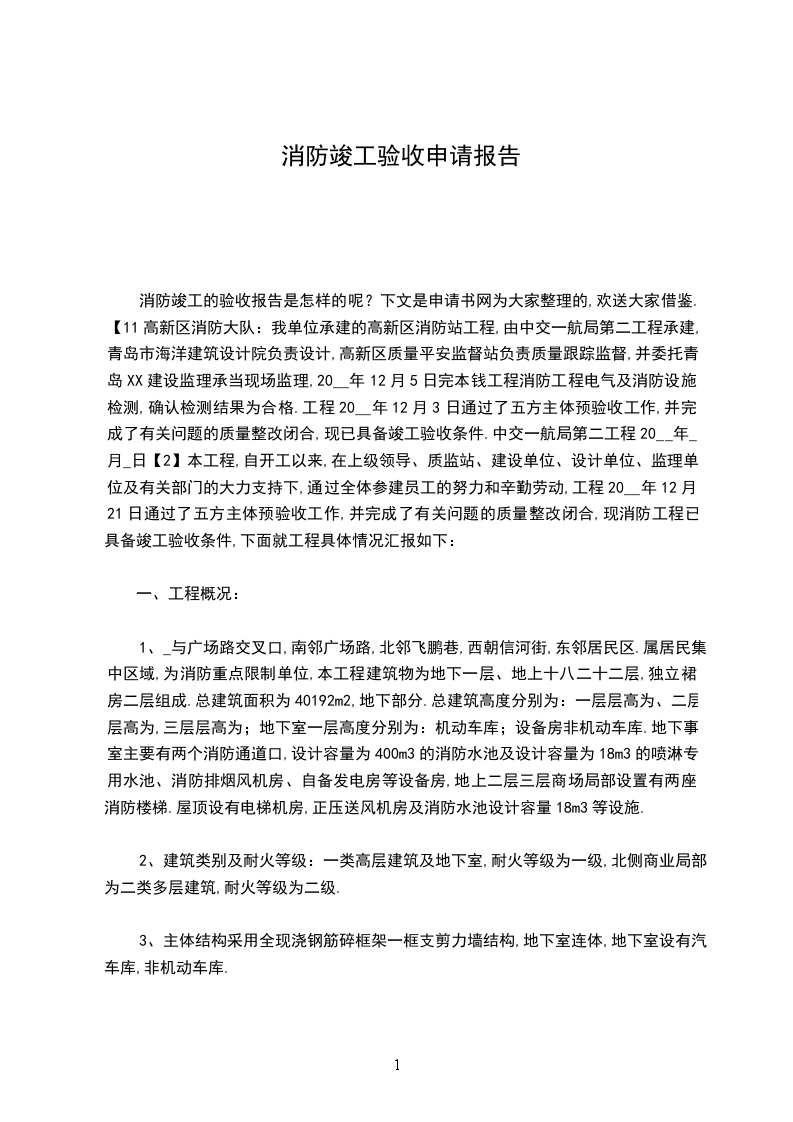 消防竣工的验收报告是怎样的呢?下文是申请书网为大家整理的,欢送大家借鉴.【11高新区消防大队:我单位承建的高新区消防站工程,由中交一航局第二工程承建,青岛市海洋建筑设计院负责设计,高新区质量平安监督站负责质量跟踪监督,并委托青岛XX建设监理承当现场监理,20__年12月5日完本钱工程消防工程电气及消防设施检测,确认检测结果为合格.工程20__年12月3日通过了五方主体预验收工作,并完成了有关问题的质量整改闭合,现已具备竣工验收条件.中交一航局第二工程20__年_月_日【2】本工程,自开工以来,在上级领导、质监站、建设单位、设计单位、监理单位及有关部门的大力支持下,通过全体参建员工的努力和辛勤劳动,工程20__年12月21日通过了五方主体预验收工作,并完成了有关问题的质量整改闭合,现消防工程已具备竣工验收条件,下面就工程具体情况汇报如下: