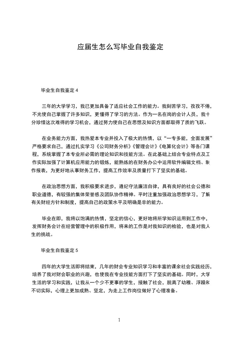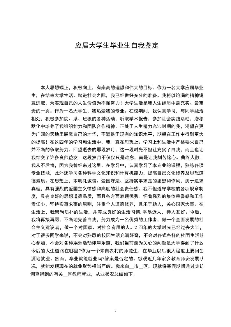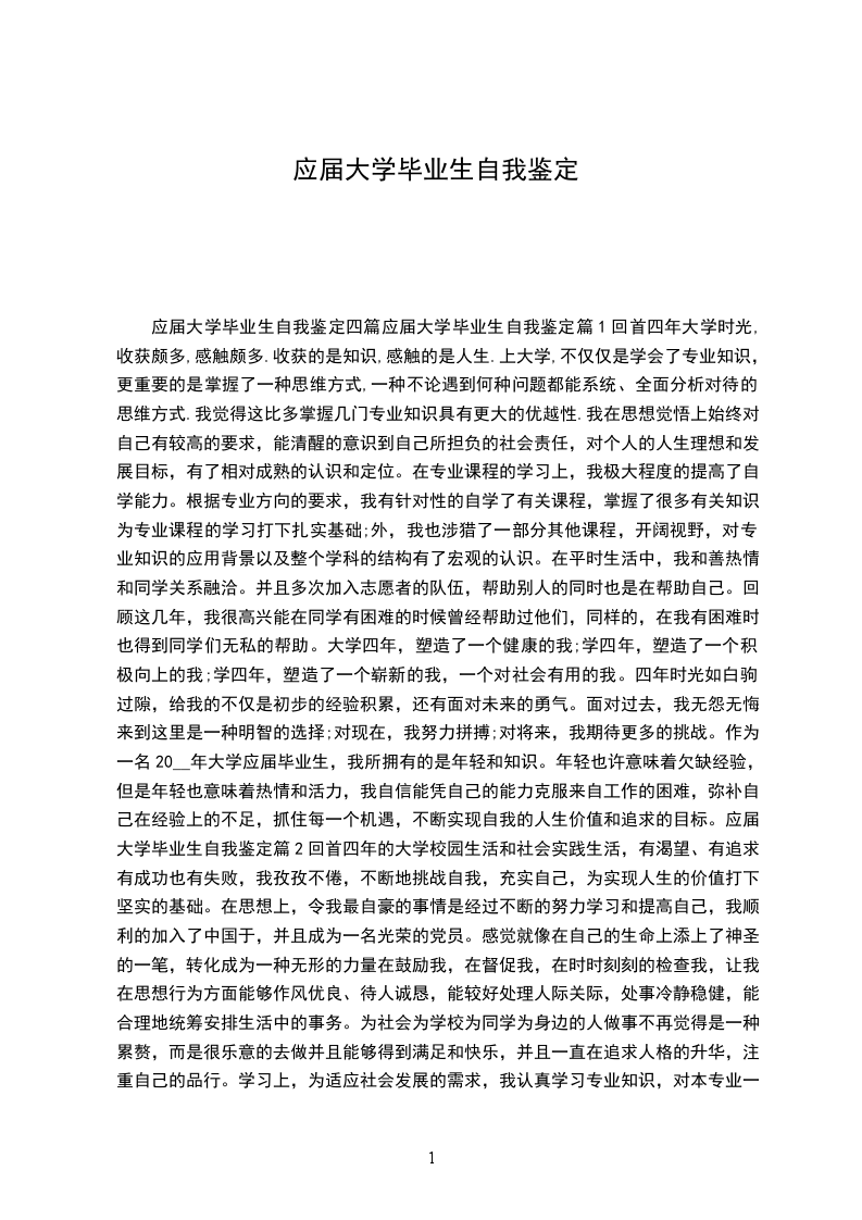 一转眼我的大学生活就这样过去了,在这四年里发生了很多很多的事情。回忆起来当初觉得很难受很痛苦的事情现在觉得也不过如此,或许这就叫做成长。你曾经以为很重要,无法舍去的甚至觉得离开了你会活不下去的,现在看来不过是过眼云烟,不足挂齿。都说成长的过程是痛苦的,确实如此,随着你慢慢的成长会发现曾经那些我们坚定不移的其实压根就不存在。但成长的痛苦中也会有一丝丝的希望,让你坚持下来的希望。那希望是你心底的一块自留地,没人能够知道里面有什么,但你知道只要那块地还没干涸你就还有着坚持下去的勇气。在这大学四年里我从大一一名刚刚入学的普通学生,变成了学生会主席。曾经刚刚成为学生会主席的时候觉得自己就是学校里的风云人物,觉得自己很厉害,但后面发现并不是那样的。学校里还是有很多有能力的人,但他们并没有像我一样招摇,他们依旧默默的做着自己的事。现在想想在他们眼里哪时的我一定很幼稚吧,但这也是成长的过程,如果今年的你觉得去年的你傻,那就说明你比去年更成熟了。如果今天的你觉得昨天的你傻,那说明你每天都在进步,都在变得更加成熟。我觉得这是好的,成长不就是不断发现自己的缺点,不断改掉自己的缺点,然后慢慢的让自己变得更优秀吗。我觉得这四年里我成长了很多,变优秀了很多。这种成长并不是说你们快来看,我是学生会主席,我手下管着好多人呢,你看我厉不厉害。而是不在意别人的看法,把自己的事情做好就行了。老话说做人要低调,做事要高调,现在感觉真的很有道理。现在的我充满自信,我自信我能做好和我相关的事情,也自信能够处理好我所交往的人际关系。这种自信是我这大学四年慢慢学习累计到的经验,并不是毫无根据的。我相信这个世界上比我优秀的人有太多太多了,但我还在成长,我有自信我能够慢慢的越来越好。年轻才是我最大的本钱,虽然很多人的本钱比我更大,但我会做到和我一样年纪的没我努力,和我一样努力的没我年轻。这个时代在不断的发展,世界在不断的变化,但我一定能够紧跟着时代的步伐,一步一步的走向光明。应届大学毕业生自我鉴定篇2大学的四年过去了,作为一名给毕业生,自己的大学时光也在已经结束了。三年的努力,一年的实习,全都成为了过去,成为了自己的记忆和经验。我很感谢自己在过去遇到的每一个人。无论是老师、同学、领导、同事,或者仅仅是有书面之缘不知名字的人。他们都给我这四年的生活带来了不小的体会。也正是他们的教导和交流,让我成为了现在的自己。那么,四年已过,大学也结束了。我在此对自己目前的能力和状况进行一次自我鉴定。希望自己鞥更清楚自己目前的状况,并及时的分析与计划,让今后的自己能做好计划,对未来有所安排。我的大学自我鉴定如下: