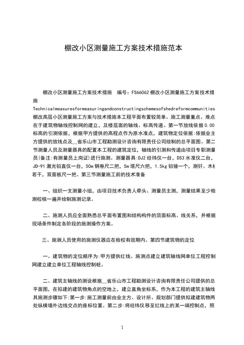 棚改小区测量施工方案技术措施 编号:FS66062棚改小区测量施工方案技术措施Technicalmeasuresformeasuringandconstructingschemesofshedreformcommunities棚改高层小区测量施工方案与技术措施本工程平面布置较简单。施工测量重点、难点在于建筑物轴线控制网的建立,及楼层面的轴线、标高传递。第一节放线依据0.00标高的引测依据,根据甲方提供的高程点作为原水准点,建筑物定位依据:依据业主方提供的放线点及__省乐山市工程勘测设计咨询有限责任公司绘制的总平面图。第二节测量人员及测量器具的配置本工程的建筑定位,轴线的引测和传递由项目专职测量员(备注:有测量员上岗证)进行施测。测量器具:DJ2经纬仪一台,DS3水准仪二台,JD-91激光铅直仪一台,50m钢卷尺二把,5m塔尺六把,1.5kg铅锤一个,测钎、木桩若干,双面板尺一把。第三节测量施工前的技术准备