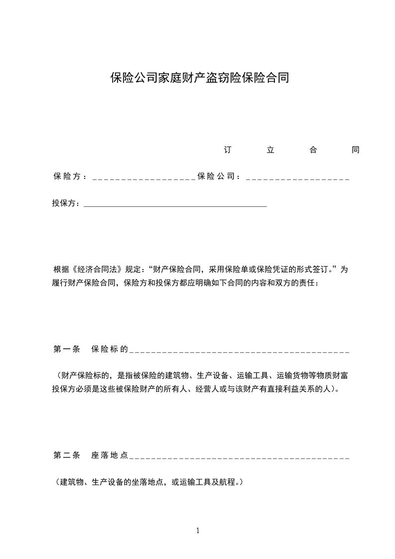 中国人民保险*司家庭财产盗窃险投保单