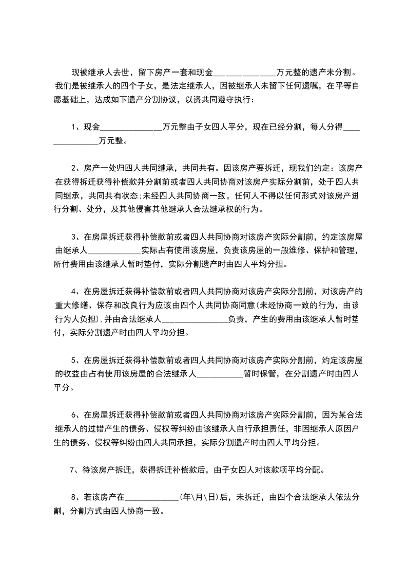 现被继承人去世,留下房产一套和现金_______________万元整的遗产未分割。我们是被继承人的四个子女,是法定继承人,因被继承人未留下任何遗嘱,在平等自愿基础上,达成如下遗产分割协议,以资共同遵守执行: