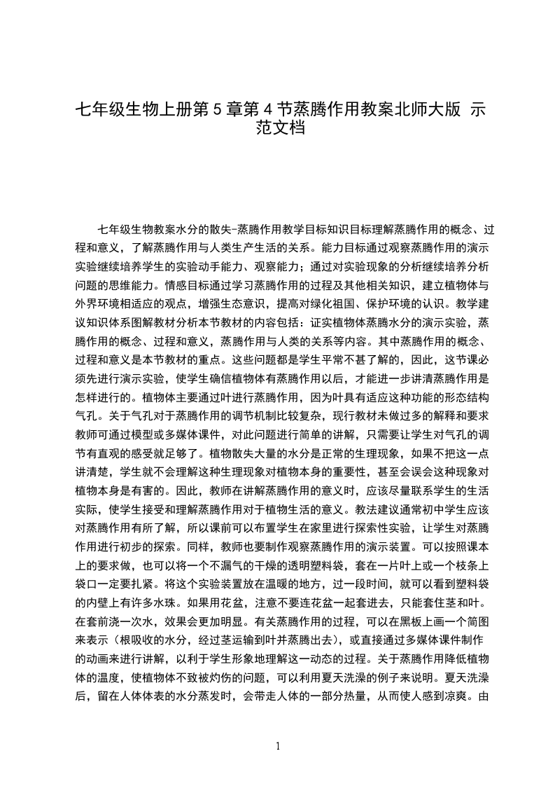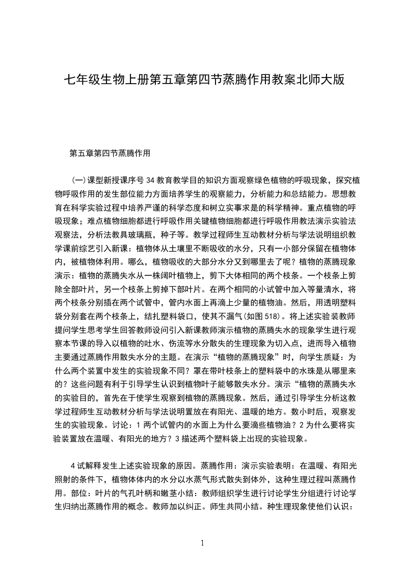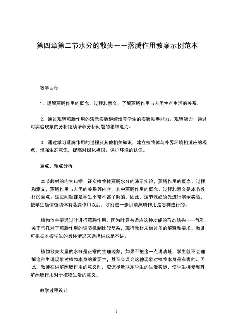 绿色植物的蒸腾作用教材分析蒸腾作用是绿色植物的一项重要的生理活动,教材对绿色植物的蒸腾作用知识的构建,从实验观察植物的蒸腾现象入手,使学生确信植物具有蒸腾现象,接着引导学生了解蒸腾作用的概念、叶片的结构及蒸腾作用的意义等。叶片是蒸腾作用的主要器官,掌握叶片的结构,学生才能透彻理解蒸腾作用的知识,同时为讲解光合作用打下基础。而叶片的结构又是与其生理功能相适应的,充分体现了结构与功能相适应的生物学观点。植物散失大量的水分是正常的生理现象,本教材强调指出蒸腾作用对植物生活的意义,同时也为学习绿色植物在生物圈中作用打下基础。教学目标