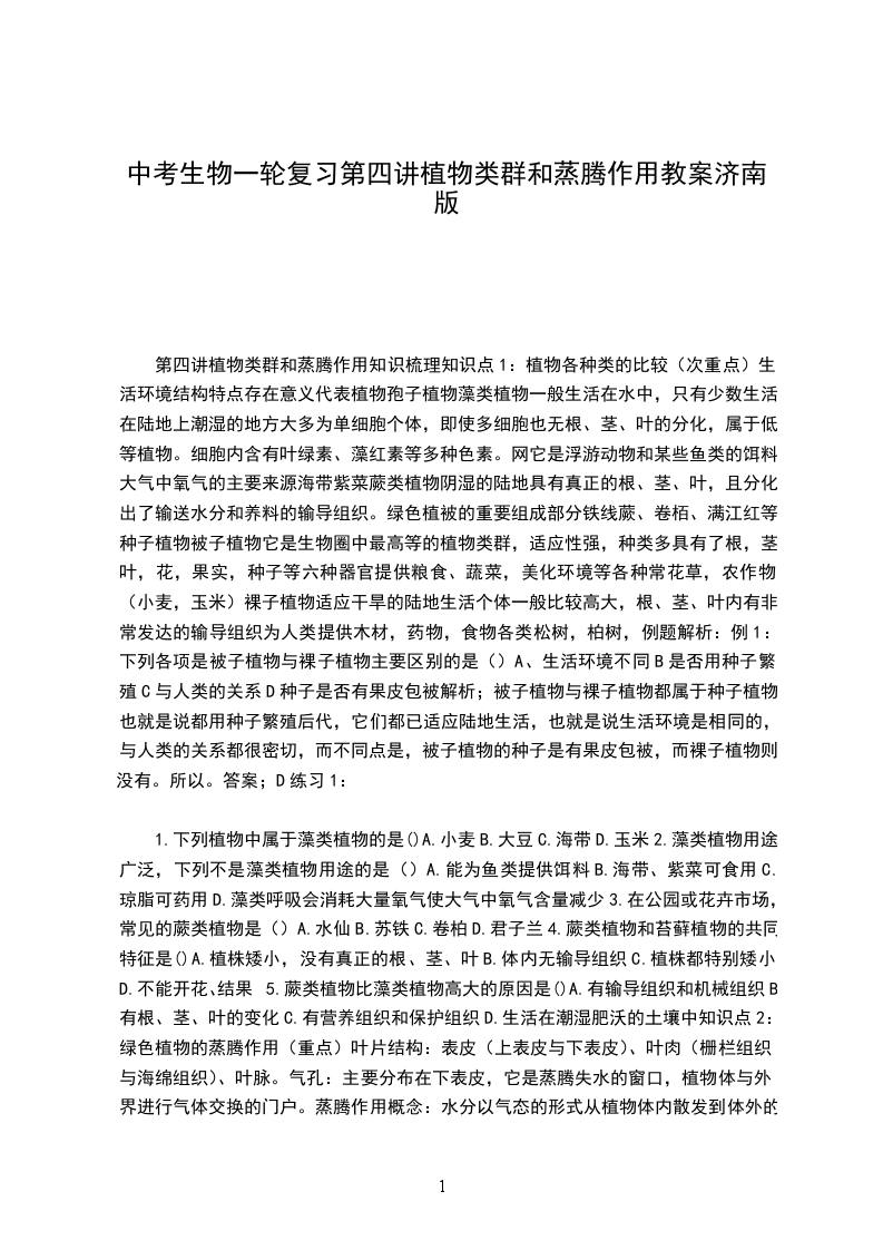 1、不能进行蒸腾作用的部位A、叶片B、叶柄C、幼嫩的茎D、幼嫩根