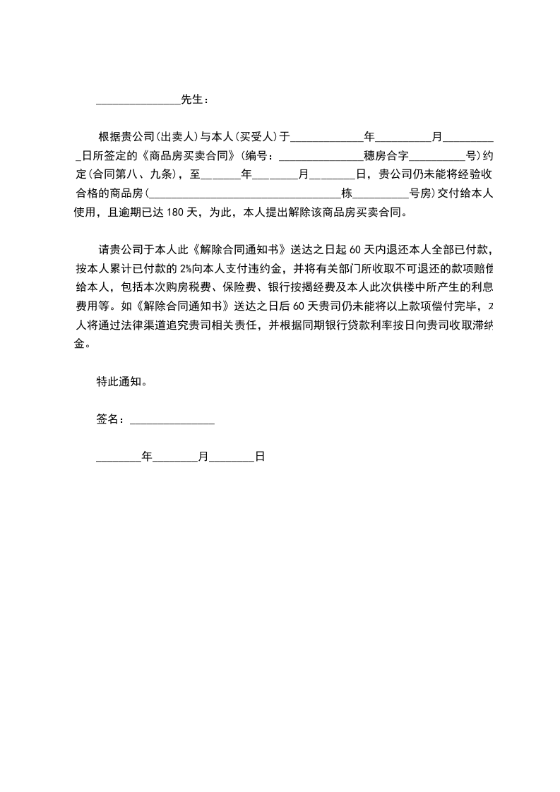 5.甲方向乙方支付全款计_________元之后,并且双方签订解除该契约的文件生效后,乙方应授权甲方至_________市国土资源与房屋管理局(下称“房地局”)办理该契约注销登记手续之全部所需文件(包括签署递交房地局的解约协议、返还甲方开具的付款票据和合同等)。