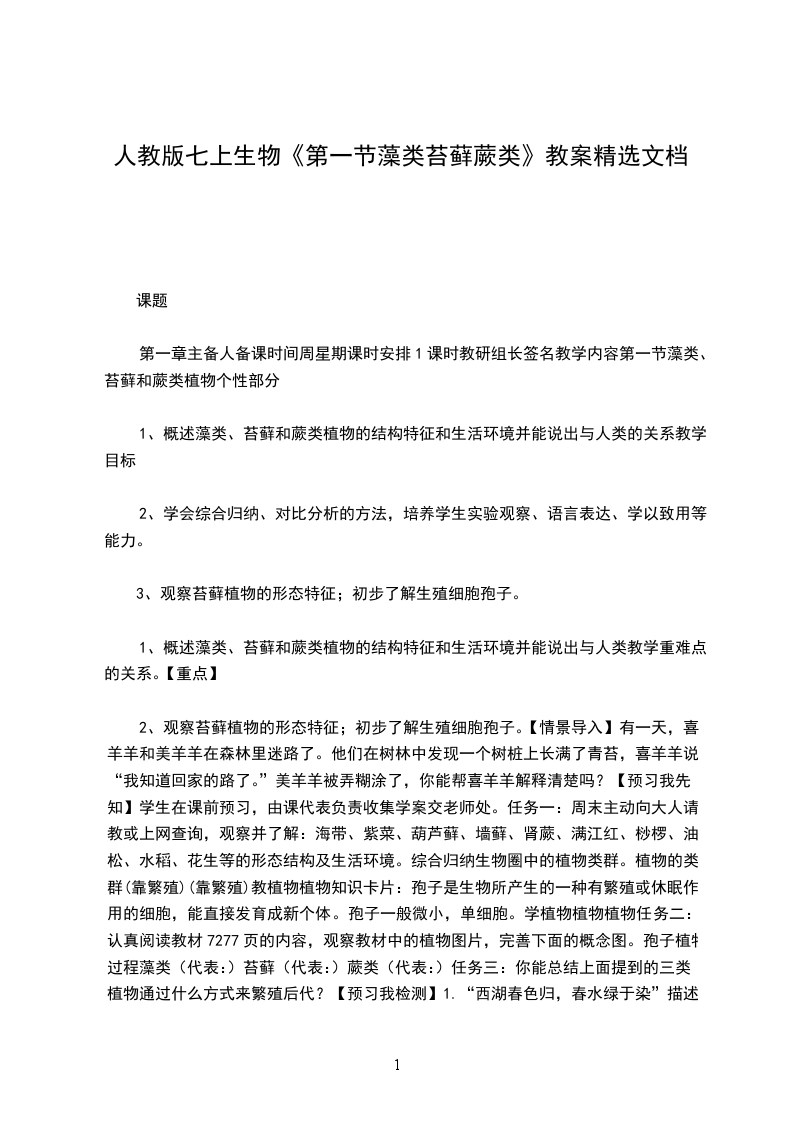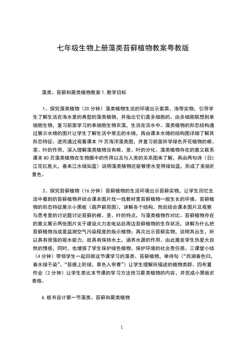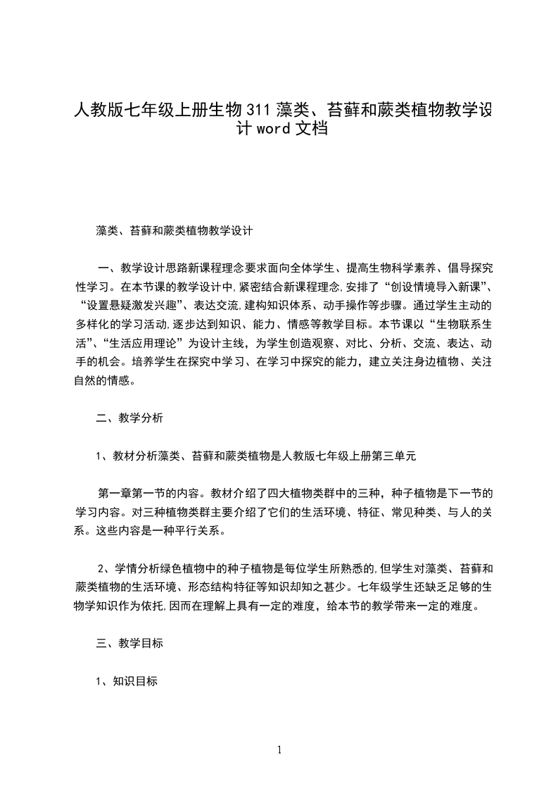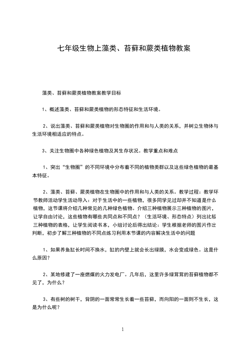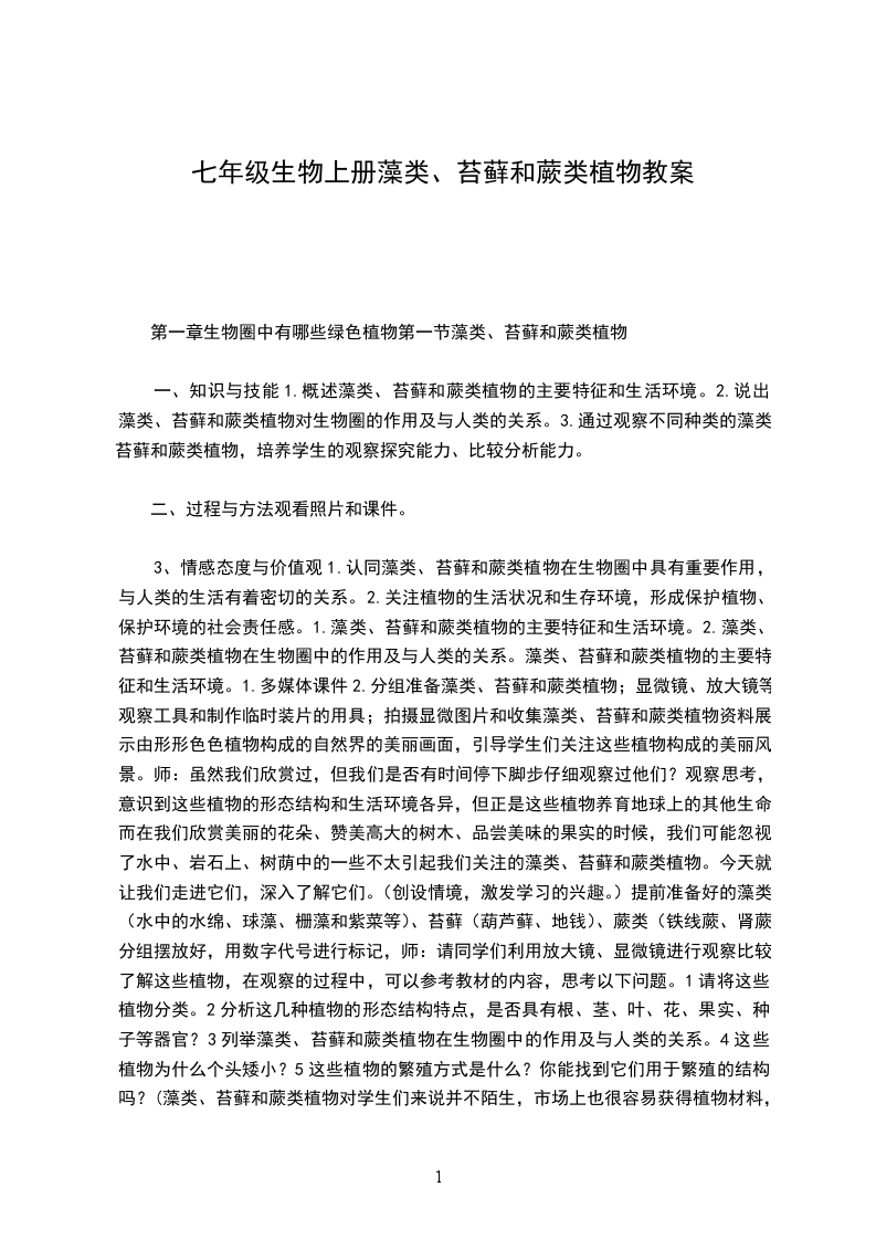3、情感态度与价值观1.认同藻类、苔藓和蕨类植物在生物圈中具有重要作用,与人类的生活有着密切的关系。2.关注植物的生活状况和生存环境,形成保护植物、保护环境的社会责任感。1.藻类、苔藓和蕨类植物的主要特征和生活环境。2.藻类、苔藓和蕨类植物在生物圈中的作用及与人类的关系。藻类、苔藓和蕨类植物的主要特征和生活环境。1.多媒体课件2.分组准备藻类、苔藓和蕨类植物;显微镜、放大镜等观察工具和制作临时装片的用具;拍摄显微图片和收集藻类、苔藓和蕨类植物资料展示由形形色色植物构成的自然界的美丽画面,引导学生们关注这些植物构成的美丽风景。师:虽然我们欣赏过,但我们是否有时间停下脚步仔细观察过他们?观察思考,意识到这些植物的形态结构和生活环境各异,但正是这些植物养育地球上的其他生命。而在我们欣赏美丽的花朵、赞美高大的树木、品尝美味的果实的时候,我们可能忽视了水中、岩石上、树荫中的一些不太引起我们关注的藻类、苔藓和蕨类植物。今天就让我们走进它们,深入了解它们。(创设情境,激发学习的兴趣。)提前准备好的藻类(水中的水绵、球藻、栅藻和紫菜等)、苔藓(葫芦藓、地钱)、蕨类(铁线蕨、肾蕨)分组摆放好,用数字代号进行标记,师:请同学们利用放大镜、显微镜进行观察比较,了解这些植物,在观察的过程中,可以参考教材的内容,思考以下问题。1请将这些植物分类。2分析这几种植物的形态结构特点,是否具有根、茎、叶、花、果实、种子等器官?3列举藻类、苔藓和蕨类植物在生物圈中的作用及与人类的关系。4这些植物为什么个头矮小?5这些植物的繁殖方式是什么?你能找到它们用于繁殖的结构吗?(藻类、苔藓和蕨类植物对学生们来说并不陌生,市场上也很容易获得植物材料,因此为比较、观察提供了可能。让学生带着探究问题进行研究,提高了学生探究的实效性。让学生比较分析10多种植物,进行分类探究,这也是培养学生分析综合、比较概括、动手实践的能力。)在实验观察的活动中同学们对于藻类、苔藓和蕨类已经有了一个较为直观系统的认识,通过汇报交流发现学生认识的不足,讨论后得出明确具体的结论。教师总结:藻类植物结构简单,大多生活在水中,是由单细胞或多细胞构成的,没有根、茎、叶等器官的分化;苔藓植物,生活在陆地上潮湿的环境中,通常具有类似茎和叶的分化,但是茎中没有导管,叶中没有叶脉,根非常简单称为假根;蕨类植物,生活在森林和山野的阴湿环境中,有根、茎、叶的分化,在这些器官中有专门运输营养物质的通道疏导组织。师:通过学生列举出的藻类、苔藓和蕨类植物与人类生活的关系,让同学们归纳、总结出这些绿色植物作为生产者为人类提供了食品、药品,净化了空气等。(实验观察活动,学生通过比较观察、小组讨论分析对于很多内容能够得出准确的答案,然而对于具体的藻类、苔藓和蕨类植物形态结构特点,特别是繁殖的结构,可能还存在不足。通过全体同学的交流分析,让原本小组内没有解决和认识错误的问题得以纠正。在交流的过程中,教师会发现学生认识的不足,实时的进行讲解。这样的过程是知识再生成的过程,更是知识应用的过程。)第一节藻类、苔藓和蕨类植物完成本课时对应的练习题。新课标要求对于生物圈中的绿色植物一章的要求,不再是侧重植物的形态结构和分类只是,而是把植物放在生物考虑。在设计课程的时候,教师应以达尔文进化论“适者生存”为核心,讲述地球原始海洋一藻类植物,到随着地壳运动和环境变化,生物形态结构发生变化,形成不同的植物如苔薛植物、藻类植物。并在讲解过程中,进行相关习题的练习和讲解。让学生形成-一个整体的概念,为之后种子植物做好铺垫。不足之处:师生互动不够,没能更多地调动学生积极性,发挥学生的主题作用。教材十分详细,应充分让学生对课本进行阅读和使用。由于过于注重对知识点的讲解,使得后面一点知识讲解很简单,练习不够。