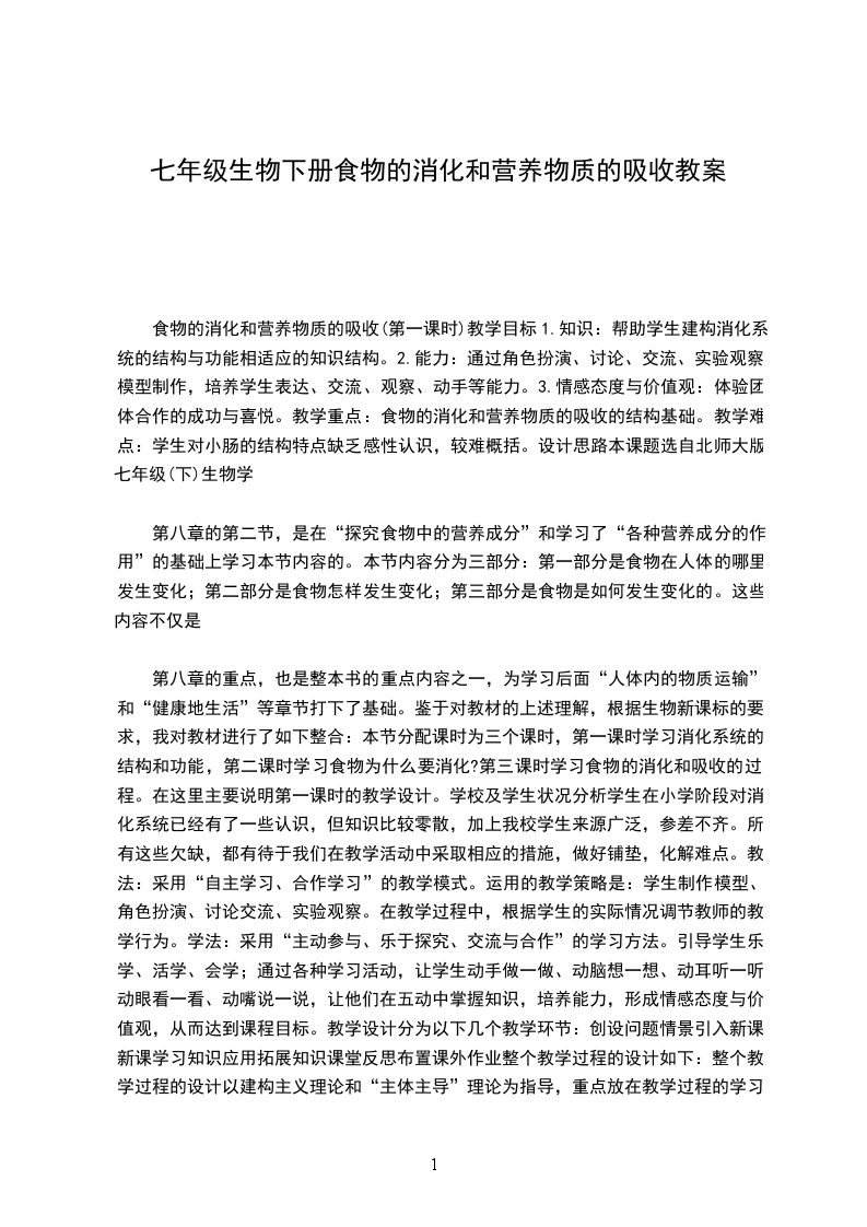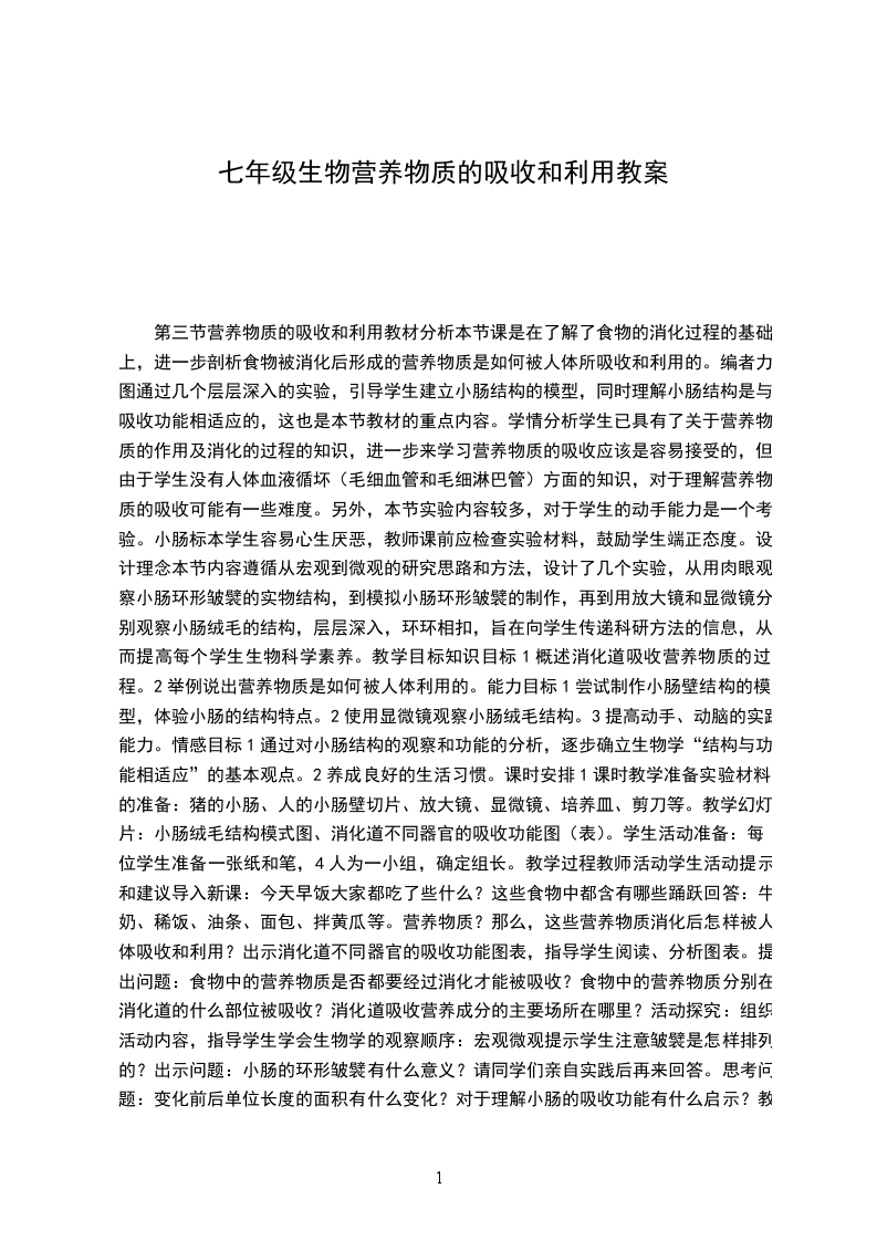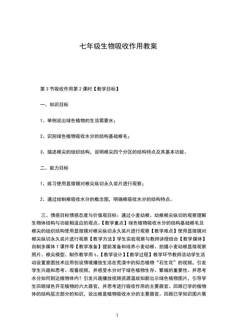 三、情感目标情感态度与价值观目标:通过小麦幼根、幼根根尖纵切的观察理解生物体结构与功能相适应的观点。【教学重点】绿色植物吸收水分的结构基础根毛及根尖的组织结构使用显微镜对根尖纵切永久装片进行观察【教学难点】使用显微镜对根尖纵切永久装片进行观察【教学方法】学生实验观察与教师讲授结合【教学媒体】自制多媒体T课件等【教学准备】提前准备和培养小麦幼根、拍摄小麦幼根显微观察照片、根尖模型、制作教学用t。【教学设计】【教学过程】教学环节教师活动学生活动设置意图技术应用创设情境播放生活在荒漠中的拟态植物“石生花”的视频,引发学生兴趣和思考。观看视频,并感受水分对于绿色植物生存、繁殖的重要性。并思考水分如何到达植物体内?引发兴趣播放视频资源温故知新出示绿色植物图片,引导学生回顾绿色开花植物的六大器官,并思考进行吸收作用的主要器官。回顾已学的植物体的结构层次部分的知识,说出根是植物吸收水分的主要器官。回顾已学知识图片展示新课讲解通过回顾叶适于进行光合作用的形态和结构,引导学生思考根完成吸收作用的结构。思考通过已知尝试解答新问题实践操作【活动1】根的结构推测:引导学生思考“植物如何能够扩大根对水分吸收的面积?”,在黑板上画出根的一部分。【活动2】观察小麦的幼根:指导学生使用放大镜对小麦幼根进行观察,重点观察根毛的结构。出示根毛数据的表格出示根毛显微图片【活动3】观察植物幼根纵切永久装片:指导学生使用显微镜观察,边观察边思考“依据细胞形态、位置、功能,可以将根尖划分成几个区域?”“哪个区域可能形成根毛细胞?”在板书根的结构图中,将根尖的结构各区的细胞形态、位置补充完整。结合根的模型对根尖的结构加以强化。依据推测,尝试在根的结构上继续画出适于吸收水分的结构。观察小麦的根尖,注意根尖的范围,并尝试对根尖分区通过根毛数据地分析,得出a、根毛数量多,表面积大的利于水分吸收的特点。根据根毛显微图片,推测根毛细胞结构特点。即b、细胞壁薄、细胞质少,c、液泡大。结合教材中根尖的图片,用显微镜观察植物幼根纵切永久装片,边观察边思考。通过对结构的猜测和对植物根尖的观察探究根的结构。板书绘图、实验材料根尖、幼根纵切永久切片、显微图片。分享交流3个活动过程前布置任务,过程中引导学生思考,并请学生汇报每个活动的猜测或观察结果。通过观察和思考,将自己的猜测或观察结果与同学进行交流。通过交流掌握学习效果绘图分享交流3个活动过程前布置任务,过程中引导学生思考,并请学生汇报每个活动的猜测或观察结果。通过观察和思考,将自己的猜测或观察结果与同学进行交流。通过交流掌握学习效果绘图效果评价根据学生的观察结果汇报,予以点评。报告观察结果考察学生认知情况归纳总结引导学生使用概念图的方式将根的吸收作用部分的概念加以梳理。在教师引导下共同绘制“根的吸收作用”概念图,进一步巩固知识。将本节课内容概括和小结绘制概念图拓展提高掌握根的结构基础后,引导学生进一步思考“根毛细胞吸收水分的条件”。思考问题为本节第二课时做铺垫图片展示,引出问题【教学评价与反思】本节课内容为根的吸收作用,植物对于学生来说比较熟悉,而且结合生活经验及光合作用的讲解,学生能够认识到水分对于植物生命活动的重要性。根有哪些结构能够完成吸收作用,是本节课重点解决的问题。本教学设计有以下几个特点:通过活动,使学生自主获得相关知识。本节课共设计了3个学生活动,即根的结构推测、小麦幼根的观察、植物幼根根尖纵切永久装片观察。后两个活动为教材中的常规活动,可使学生通过观察对根毛和根尖的结构有清晰认识。第一个活动为教师考察学生已有知识和推理能力而设计,通过问题“根如何扩大对于吸收水分的面积”的提出,请学生猜测根的结构。事实表明,学生能够在黑板上画出从主根分出的多条侧根,这与学生的生活常识是一致的。但对于每一个根尖所具备的结构,学生的概念是空白的。这就需要后两个活动来进一步支持。借助于概念图,使学生对根的吸收部分的知识加以巩固。从学期初开始,教师便注重概念图教学。如生态因素、细胞的结构、细胞分裂、生物体的结构层次等知识点都使用概念图对知识进行总结与巩固。因此学生对绘制概念图的基本方法有了较熟练地掌握,如果绘制出结构合理、概念全面、概念间关系科学的概念图,说明学生对此知识点已经掌握。本节课通过绘制根吸收水分的概念图,可以考察学生的学习效果。
