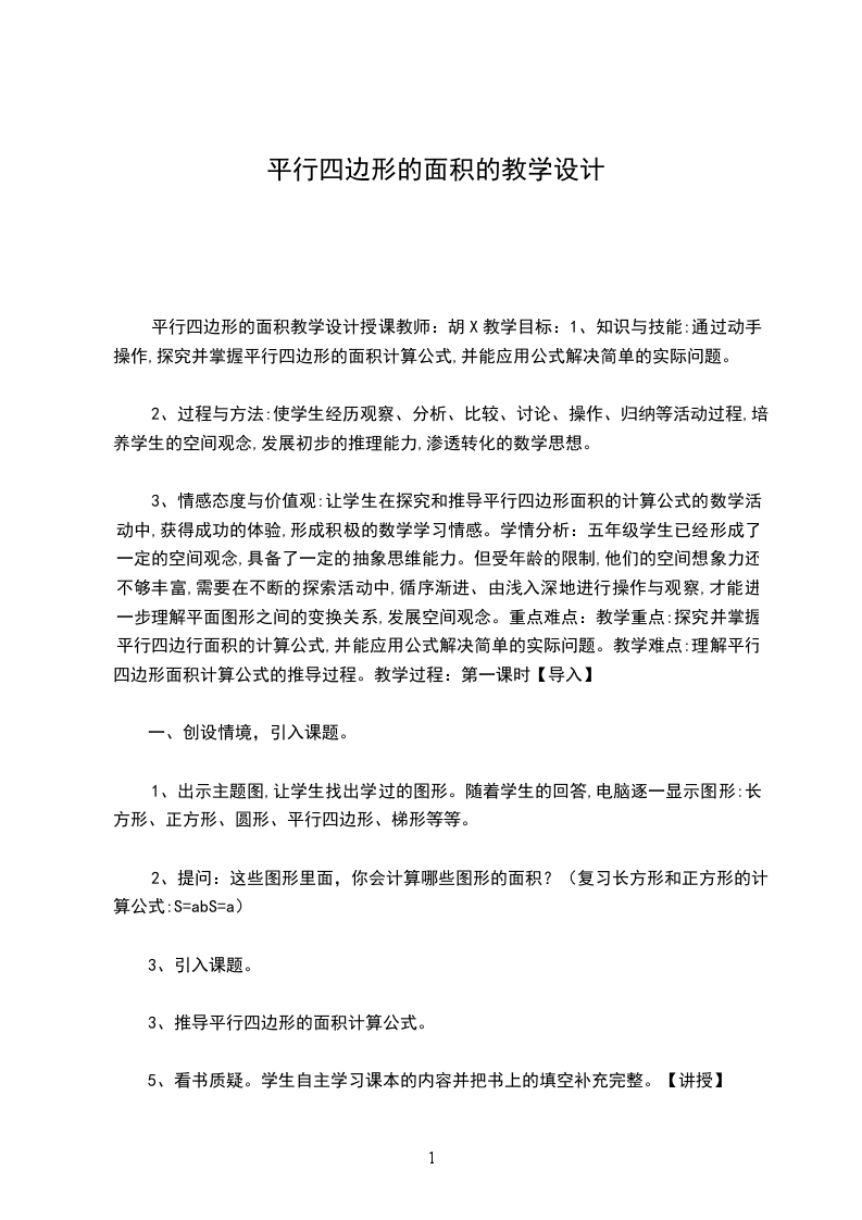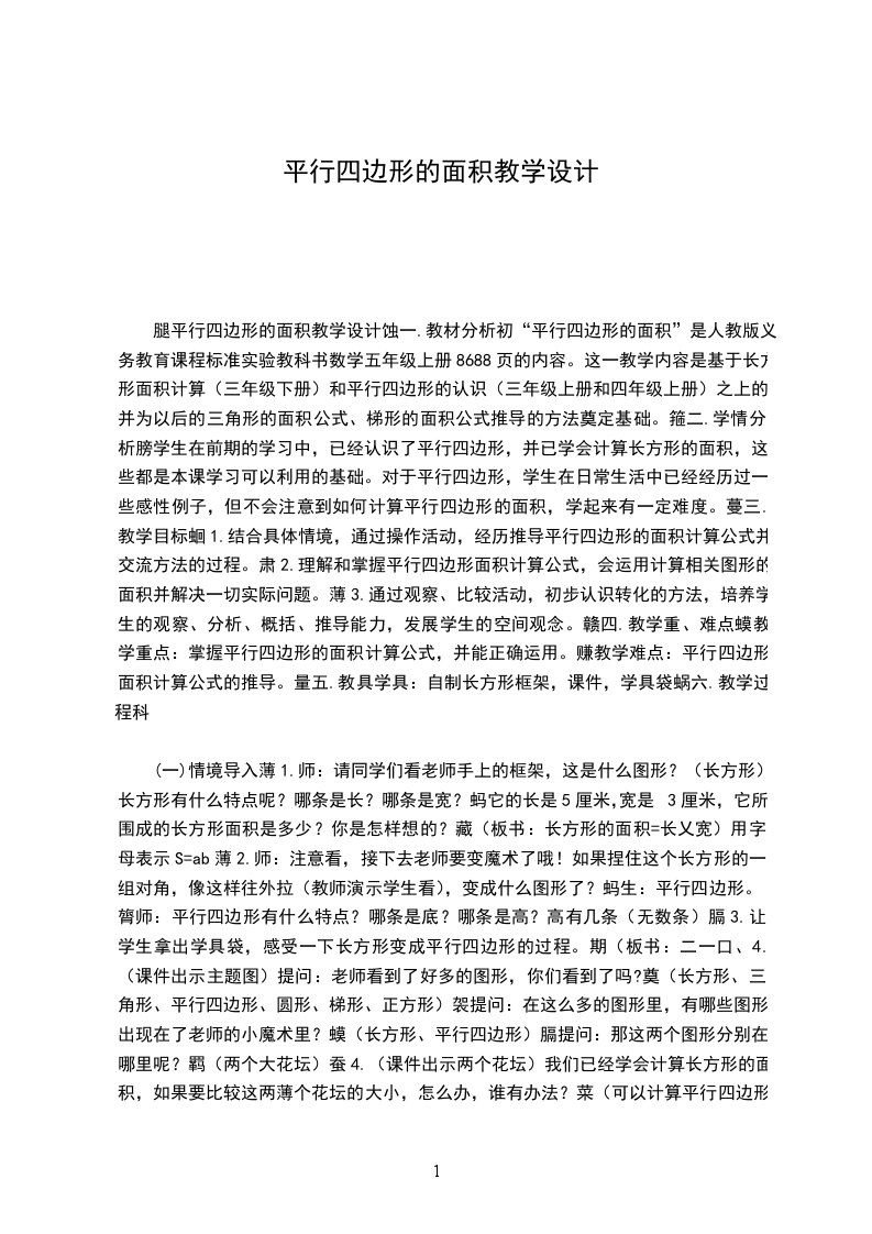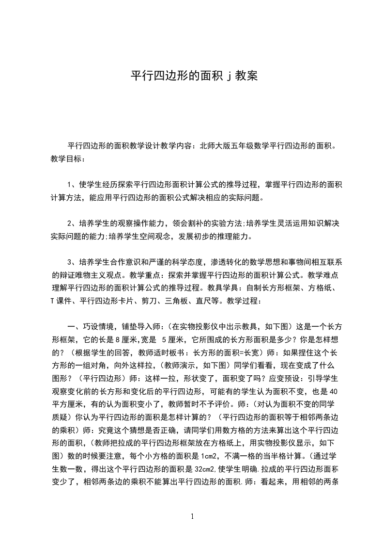 腿平行四边形的面积教学设计蚀一.教材分析初“平行四边形的面积”是人教版义务教育课程标准实验教科书数学五年级上册8688页的内容。这一教学内容是基于长方形面积计算(三年级下册)和平行四边形的认识(三年级上册和四年级上册)之上的,并为以后的三角形的面积公式、梯形的面积公式推导的方法奠定基础。箍二.学情分析膀学生在前期的学习中,已经认识了平行四边形,并已学会计算长方形的面积,这些都是本课学习可以利用的基础。对于平行四边形,学生在日常生活中已经经历过一些感性例子,但不会注意到如何计算平行四边形的面积,学起来有一定难度。蔓三.教学目标蛔1.结合具体情境,通过操作活动,经历推导平行四边形的面积计算公式并交流方法的过程。肃2.理解和掌握平行四边形面积计算公式,会运用计算相关图形的面积并解决一切实际问题。薄3.通过观察、比较活动,初步认识转化的方法,培养学生的观察、分析、概括、推导能力,发展学生的空间观念。赣四.教学重、难点蟆教学重点:掌握平行四边形的面积计算公式,并能正确运用。赚教学难点:平行四边形面积计算公式的推导。量五.教具学具:自制长方形框架,课件,学具袋蜗六.教学过程科