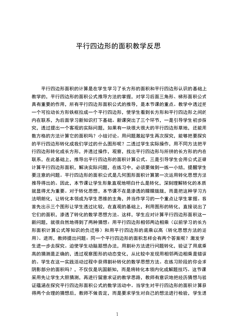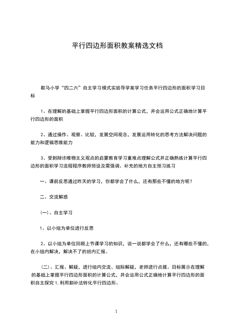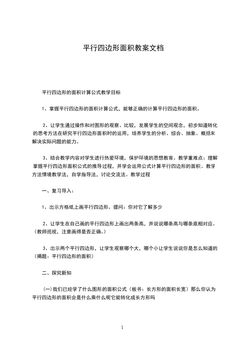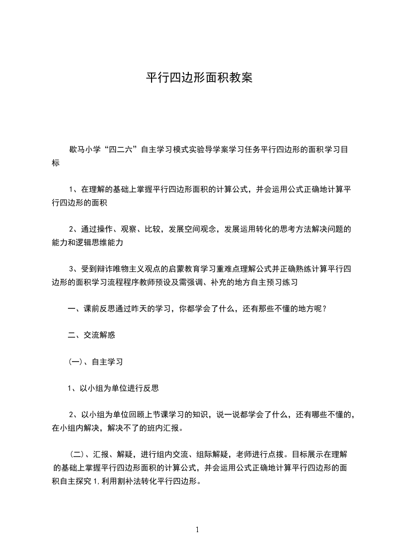 腿平行四边形的面积教学设计蚀一.教材分析初“平行四边形的面积”是人教版义务教育课程标准实验教科书数学五年级上册8688页的内容。这一教学内容是基于长方形面积计算(三年级下册)和平行四边形的认识(三年级上册和四年级上册)之上的,并为以后的三角形的面积公式、梯形的面积公式推导的方法奠定基础。箍二.学情分析膀学生在前期的学习中,已经认识了平行四边形,并已学会计算长方形的面积,这些都是本课学习可以利用的基础。对于平行四边形,学生在日常生活中已经经历过一些感性例子,但不会注意到如何计算平行四边形的面积,学起来有一定难度。蔓三.教学目标蛔1.结合具体情境,通过操作活动,经历推导平行四边形的面积计算公式并交流方法的过程。肃2.理解和掌握平行四边形面积计算公式,会运用计算相关图形的面积并解决一切实际问题。薄3.通过观察、比较活动,初步认识转化的方法,培养学生的观察、分析、概括、推导能力,发展学生的空间观念。赣四.教学重、难点蟆教学重点:掌握平行四边形的面积计算公式,并能正确运用。赚教学难点:平行四边形面积计算公式的推导。量五.教具学具:自制长方形框架,课件,学具袋蜗六.教学过程科