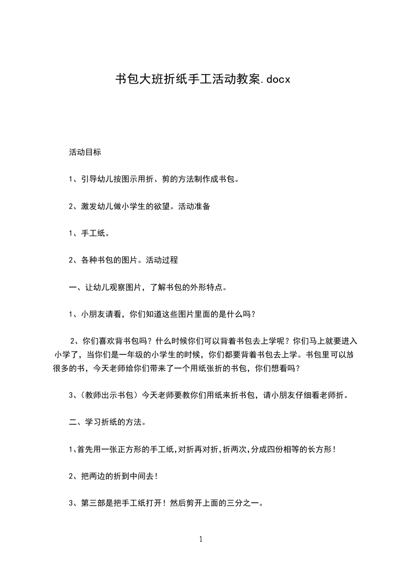 2、你们喜欢背书包吗?什么时候你们可以背着书包去上学呢?你们马上就要进入小学了,当你们是一年级的小学生的时候,你们都要背着书包去上学。书包里可以放很多的书,今天老师给你们带来了一个用纸张折的书包,你们想看吗?