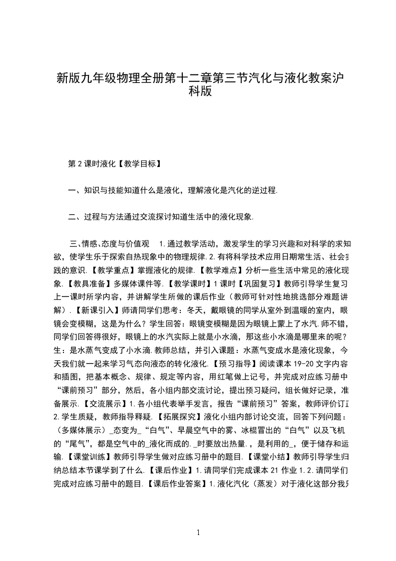 三、情感、态度与价值观1.通过教学活动,激发学生的学习兴趣和对科学的求知欲,使学生乐于探索自热现象中的物理规律.2.有将科学技术应用日期常生活、社会实践的意识.【教学重点】掌握液化的规律.【教学难点】分析一些生活中常见的液化现象.【教具准备】多媒体课件等.【教学课时】1课时【巩固复习】教师引导学生复习上一课时所学内容,并讲解学生所做的课后作业(教师可针对性地挑选部分难题讲解).【新课引入】师请同学们思考:冬天,戴眼镜的同学从室外到温暖的室内,眼镜会变模糊,这是为什么?学生回答:眼镜变模糊是因为眼镜上蒙上了水汽.师不错,同学们回答得很好,眼镜上的水汽实际上就是小水滴,那这些小水滴是哪里来的呢?生:是水蒸气变成了小水滴.教师总结,并引入课题:水蒸气变成水是液化现象,今天我们就一起来学习气态向液态的转化液化.【预习指导】阅读课本19-20文字内容和插图,把基本概念、规律、规定等内容,用红笔做上记号,并完成对应练习册中“课前预习”部分,然后,各小组内部交流讨论,提出预习疑问,组长做好记录,准备展示.【交流展示】1.各小组代表举手发言,报告“课前预习”答案,教师评价订正.2.学生质疑,教师指导释疑.【拓展探究】液化小组内部讨论交流,回答下列问题:(多媒体展示)_态变为_“白气”、早晨空气中的雾、冰棍冒出的“白气”以及飞机的“尾气”,都是空气中的_液化而成的._时要放出热量.,是利用的_,便于储存和运输.【课堂训练】教师引导学生做对应练习册中的题目.【课堂小结】教师引导学生归纳总结本节课学到了什么.【课后作业】1.请同学们完成课本21作业1.2.请同学们完成对应练习册中的题目.【课后作业答案】1.液化汽化(蒸发)对于液化这部分我只作简单介绍,其中压缩体积使气体液化,学生是想不到的,我建议教学中多举一些例子,提供真实的现象让学生思考,拓展其思维空间.