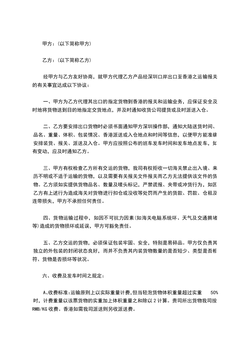 经甲方与乙方友好协商,就甲方代理乙方产品经深圳口岸出口至香港之运输报关的有关事宜达成以下协议: