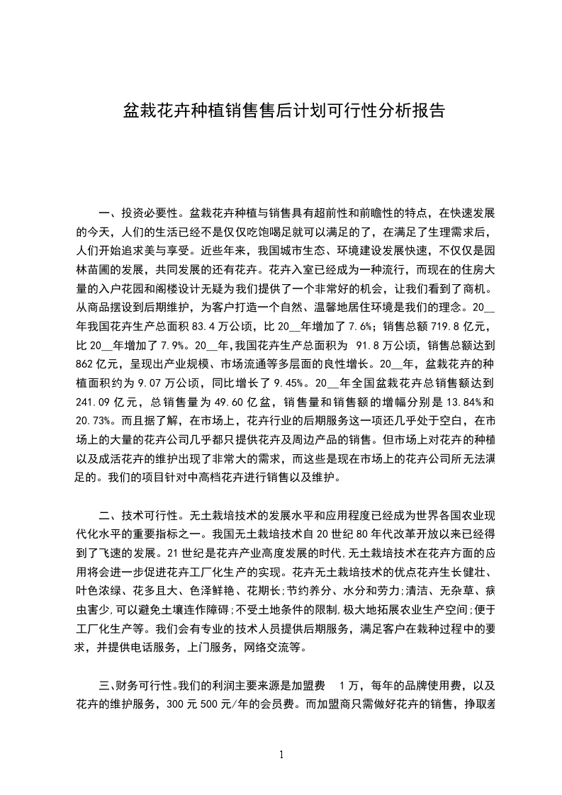 一、投资必要性。盆栽花卉种植与销售具有超前性和前瞻性的特点,在快速发展的今天,人们的生活已经不是仅仅吃饱喝足就可以满足的了,在满足了生理需求后,人们开始追求美与享受。近些年来,我国城市生态、环境建设发展快速,不仅仅是园林苗圃的发展,共同发展的还有花卉。花卉入室已经成为一种流行,而现在的住房大量的入户花园和阁楼设计无疑为我们提供了一个非常好的机会,让我们看到了商机。从商品摆设到后期维护,为客户打造一个自然、温馨地居住环境是我们的理念。20__年我国花卉生产总面积83.4万公顷,比20__年增加了7.6%;销售总额719.8亿元,比20__年增加了7.9%。20__年,我国花卉生产总面积为91.8万公顷,销售总额达到862亿元,呈现出产业规模、市场流通等多层面的良性增长。20__年,盆栽花卉的种植面积约为9.07万公顷,同比增长了9.45%。20__年全国盆栽花卉总销售额达到241.09亿元,总销售量为49.60亿盆,销售量和销售额的增幅分别是13.84%和20.73%。而且据了解,在市场上,花卉行业的后期服务这一项还几乎处于空白,在市场上的大量的花卉公司几乎都只提供花卉及周边产品的销售。但市场上对花卉的种植以及成活花卉的维护出现了非常大的需求,而这些是现在市场上的花卉公司所无法满足的。我们的项目针对中高档花卉进行销售以及维护。