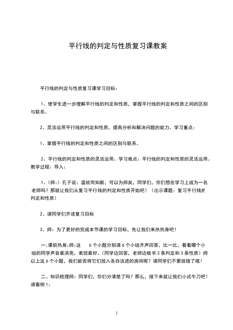 1、使学生进一步理解平行线的判定和性质,掌握平行线的判定和性质之间的区别与联系。