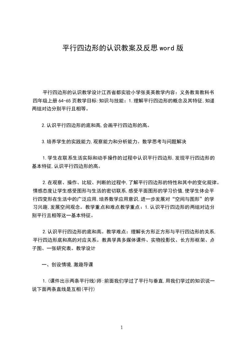 五、全课总结。通过本节课的学习,你有哪些收获?达标课教学反思认识平行四边形登封市书院河路小学冯巧丽20__年10月9日认识平行四边形教学反思:回顾这节课,我在为学生创设生活情景时,带领同学们一起观看我们书院河路小学伸缩门于和打开的视频,让学生如身临其境般地感受到门的开和关的情况。接着将画面定格,让学生找出四边形,从而提取出平行四边形。紧接着,我又安排了两个力量悬殊的同学上台拉一拉用木条制成的三角形和平行四边形,让他们真实感受平行四边形具有容易变形的特性,从而引导学生回到生活,知道伸缩门的设计就是利用了这点。本节课,我大胆尝试放手让学生去创作平行四边形,在昨天晚上预习的基础上,小组合作通过摆一摆、围一围、画一画、折一折、剪一剪、拼一拼等活动,让学生能够通过多种方法制作出平行四边形。不管是在钉子板上“围”出平行四边形,在方格纸上“画”出平行四边形,还是用一张纸“折”出平行四边形、“剪”出平行四边形,学生参与都非常积极,并且基本能够做出来一个平行四边形。对于学生展示出的每一种方法,我都请学生说出制作平行四边形时要注意什么?在方格纸上画平行四边形是本节课的重点,也是难点,所以学生交流画平行四边形时,我通过课件演示先定点再连线,并在黑板上和学生一起画出一个平行四边形。在探究平行四边形的特征中,我让学生充分展示了自己的发现,并通过动画演示,让学生直观感知出平行四边形的对边相等,从而加深了平行四边形对边相等这一主要特征。当然,这节课也有一些遗憾。如:在课的组织上不够好,活动较多所以一些乱。由于时间安排不够合理,有一道练习没有完成。今后我会继续努力,多反思、多进步,进一步提高自己的业务素质。
