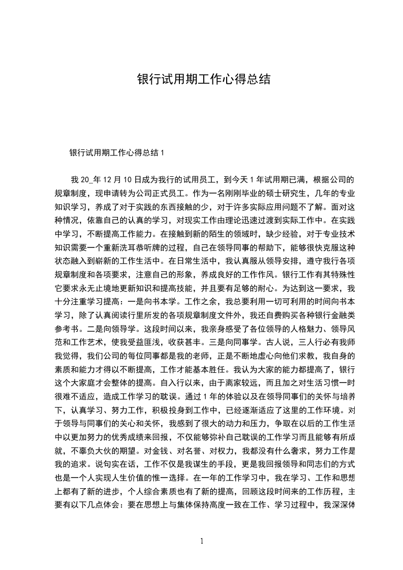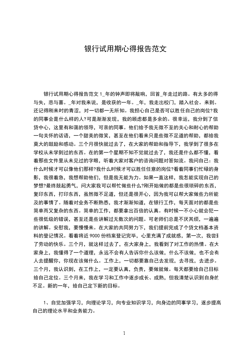 银行试用期心得报告范文1_年的钟声即将敲响,回首_年走过的路。有太多的得与失,悲与喜。_年对我来说,是收获的一年。_年,我走出校门,踏入社会。来到。还记得刚来时的青涩,对一切都一无所知。我担心自己是否可以胜任自己的岗位?我的同事会是什么样的人?可是渐渐发现,我的顾虑都是多余的。很幸运,我分到了信贷中心,这里有和蔼的领导,可亲的同事。他们给予我无微不至的关心和耐心的帮助。一句关怀的话语,一个甜美的微笑,甚至在他们看来只是些微不足道的帮助,都给我莫大的鼓励和感动。三个月很快就过去了,在大家的帮助和指导下,我学到了很多在学校从未学到过的东西。在的第一个星期不知不觉就过去了,我还是什么都不懂,看着那些文件里从未见过的字眼,听着大家对客户的咨询问题对答如流。我问自己:我什么时候才可以像他们那样?我什么时候才可以胜任任意的岗位?看着同事们忙碌的身影,我很着急,我想帮助他们,但是我无能为力。如果一直这样,我怎能实现自己的梦想?最终鼓起勇气,问大家我可以帮忙做些什么?刚开始做的都是些很琐碎的东西,复印东西,打印东西,虽然微不足道,但还是很开心,因为我可以帮大家做些力所能及的事情了。随着对业务不断熟悉,我才渐渐知道,在银行工作,每天面对的都是些简单而又复杂的东西。简单的工作,都要拿出百倍的认真。有时候一不小心就会犯一些很低级的错误,甚至还是些讲解过无数次的问题。可老师们总是不厌其烦,一遍遍的讲解。安慰我,要慢慢来。在大家的共同努力下,我们提前完成了个贷文档基本资料的登记情况。看着将近9000份档案登记完毕,心里充满了成就感,第一次,我尝到了劳动的快乐。三个月,就这样过去了,在大家身上,我看到了对工作的热情。在大家身上,我懂得了一个道理,永远不会有人告诉你什么该做,什么不该做,也不会有人去提醒你,你现在该做什么。工作上,一切都要靠自己去发现,去寻找,去进步。三个月,我认识到,在工作上,一定要认真,负责,要做就做。每天都要给自己目标,给自己定位。三个月来,我在学习和工作中逐步成长、成熟,但我清楚认识到自身的不足。新的一年,给自己定下新的目标。