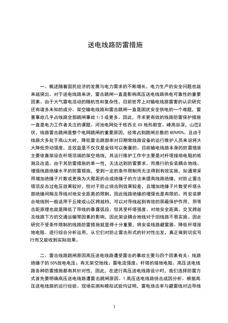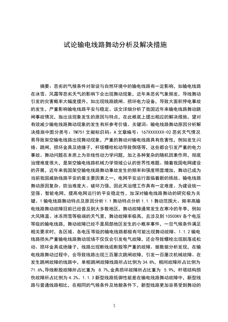 摘要:恶劣的气候条件对架设与自然环境中的输电线路有一定影响,如输电线路在冰雪、风霜等恶劣天气的影响下会出现舞动现象,近年来恶劣气象频发,导线舞动引发的灾害概率大幅度提升,如出现线路跳闸、损坏电力设备,导致大面积停电事故的发生,严重影响输电线路平安与稳定。该文详细分析了我国近年来输电线路舞动跳闸事故情况,指出该现象发生的原因与特点,在此根底上提出相应的解决措施,望对有效减少输电线路舞动现象的发生有所参考价值。关键词:输电线路舞动原因分析解决措施中图分类号:TM751文献标识码:A文章编号:167XXXXXXX-02恶劣天气情况易导致架空输电线路出现舞动现象,严重的舞动对输电线路具有危害性,例如发生闪络、跳闸,损坏金具及绝缘子,杆塔螺栓松动导致倒塔等,这些都会引发严重的电力事故。舞动问题在本质上为非线性动力学问题,加之各种复杂的随机因素作用,彻底治理难度很大,是架空输电线路机械力学领域公认的世界性难题。随着我国电网建设的开展,近年来我国架空输电线路舞动事故发生的频率和强度明显增加,舞动已成为当前我国威胁线路平安的最主要因素之一,电网平安运行面临着新的挑战。输电线路舞动原因复杂、防治难度大、破坏力强,因此其治理工作具有一定难度。为建设统一、坚强、智能电网,提高电网运行的平安稳定性,加深对输电线路舞动的研究极为关键。1输电线路舞动特点及原因分析1.1舞动特点分析1.1.1舞动范围大、频率高输电线路舞动故障目前已经普及到大多数地区,舞动故障通常发生在寒冷的冬季,例如大风降温、冰冻雨雪等极端的天气里,舞动故障率极高,且涉及到10500KV各个电压等级的输电线路,舞动故障已经不是局部地区发生的小概率事件,一旦气候条件满足相关要求时,各区域、各电压等级的输电线路都极有可能出现舞动故障。1.1.2输电线路损失严重输电线路舞动现场不仅仅会引发电气故障,还会导致螺栓出现脱落或松动、损坏金具或绝缘子,线路出现断线或断股等严重的故障。据数据分析发现,在输电线路舞动过程中,会导致线路出现三百屡次跳闸故障,引发一百屡次机械故障。在发生跳闸故障的线路中,单相跳闸故障线路所占比例为34.8%,相间故障所占比例为71.6%,导线断股故障所占比重为8.7%,金具损坏故障所占比重为5.9%,杆塔结构损伤故障所占比例为4.2%。1.1.3新型线路抵御性能差在输电线路舞动故障中,新型线路与普通线路相比,在相同的气候条件及地貌条件下,新型线路更加容易受到舞动的影响,一旦出现舞动,也更易出现跳闸故障、机械故障。近年来的分析发现,同塔双回线路发生舞动现象的频率最高,单回线路舞动频率远高于紧凑型线路。1.2舞动故障原因分析输电线路舞动故障的发生与风速、风向、流态、线路结构及参数等因素密切相关。其原因主要表现在以下几个方面:第一,目前各电压等级输电线路设计规程中没有明确标识出线路舞动的防治技术措施,更没有明确划分出易舞区段,这就导致后期防舞措施的实施。第二,线路设计荷载一般为静载负荷,而输电线路在舞动过程中,会出现较大的动载荷,舞动会增加杆塔横担挂线等部位的承受荷载超出设计荷载,从而会导致横担及铁塔螺栓等遭受破坏。第三,在设计杆塔的过程中,风荷载方向及线路转角度数是固定的。而输电线路的舞动方向存在随意性,因此线路的转向度数极有可能超出设计值,从而导致横担方向力超出杆塔设计承载力,最终导致横担失稳或发生损坏。2输电线路舞动的解决措施2.1抗舞措施抗舞措施的特征是:不会破坏舞动条件,而通过提高线路电气及机械强度有效减少输电线路舞动现象的出现,确保电力设备在线路舞动过程中保持平安运行。提高输电线路及相关设备的机械强度,能够有效降低设备遭受舞动故障的损失。具体措施如下:提高杆塔塔身及横担的刚度、改善金具的耐振性,这些措施都能够提高杆塔结构的动态荷载,防止金具出现松动或损坏。2.2避舞措施避舞措施是指,工作人员在分析当地的气候条件及地形地貌的根底上,合理选择输电线路的路径及走向。由于大风、覆冰气象频发区域输电线路舞动现象较为频繁,因此工作人员在设计线路的过程中,要能够避开这些区域,例如江河、峡谷、山脊等特殊区域。除此之外,还要能够尽量确保输电线路的走向与主导风向相平行。与此同时,还需要做好以下措施:首先,对于已发生舞动的输电线路,要能够予以足够的重视,采取相应的防舞措施,对于其他未发生舞动的区域线路,工作人员要能够做好地形地貌、线路走向等因素的分析工作,结合实际情况做好防范措施。其次,工作人员要能够分析舞动线路同区域未舞动线路的可能性,对可能性较高的线路采取防治措施,同塔双回线路中一条线路必须要采取防舞措施。最后,对于220KV及500KV以上电压等级的输电线路,工作人员要能够结合多项因素来分析输电线路的舞动可能性,必要时需要采取相关防舞治理措施。2.3抑舞措施抑舞措施主要是在舞动故障频发的输电线路上,安装防舞装置以此来抑制线路舞动的幅度,最终保障输电线路正常运行。具体措施如下:在导线上缠绕绕流线。使用特定的绕流线来缠绕导线,可以减少导线外表覆冰现象的出现,从而破坏舞动形成条件;在输电线路上安装空气动力阻尼器,一旦输电线路受到风力的作用,