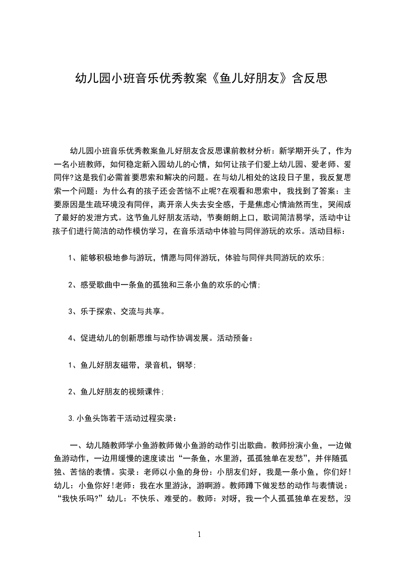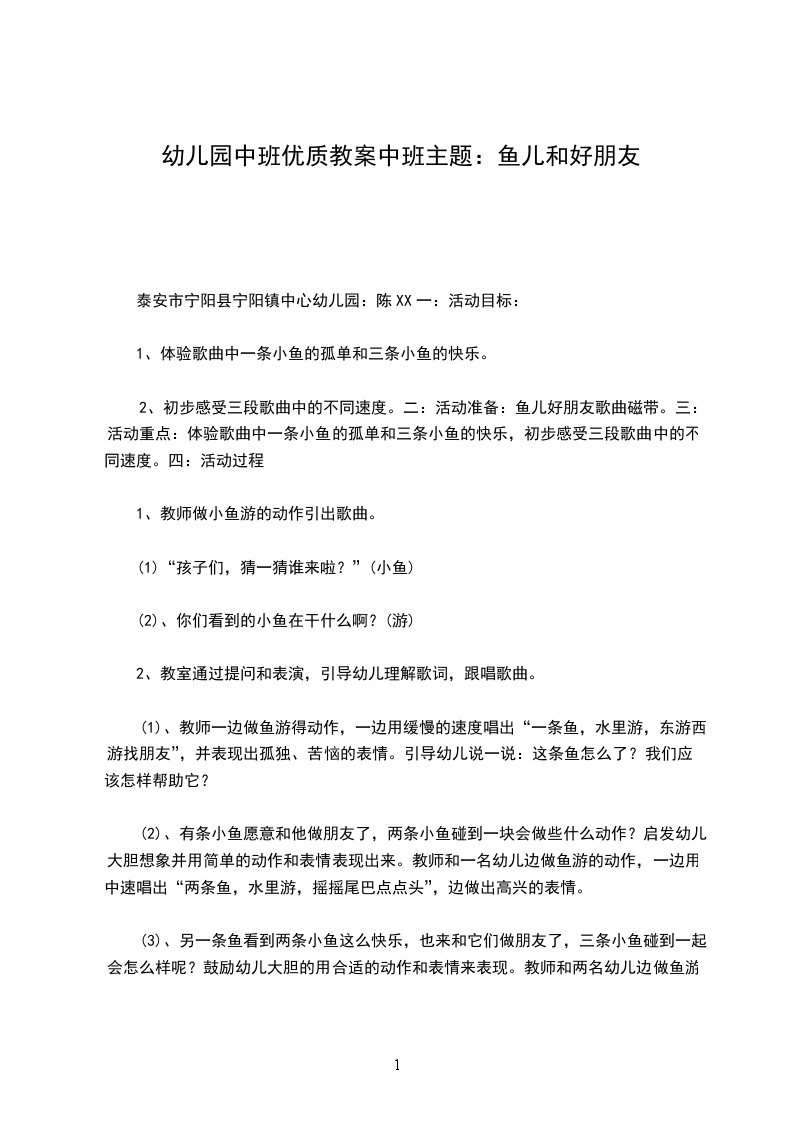 三、交流画好了的孩子们请你们搬着你们的小椅子和你们的画回到你们的位子上,然后你可以和你的好朋友一起说说你的鱼儿好朋友吹了几个泡泡。小班教案鱼儿好朋友4【教材分析】鱼儿好朋友是一首比较简短的歌曲,内容形象有趣,朗朗上口,表现了朋友在一起的快乐,非常符合小班幼儿的年龄特点。是对刚入园幼儿进行喜欢同伴、乐于和同伴玩耍,进行团结友爱教育的好教材。活动中让幼儿将自己比喻成小鱼,在学习歌曲、做游戏的过程中,结交自己的好朋友,通过学习歌曲能让幼儿体验一个人的孤独和多个人的欢乐。【活动目标】