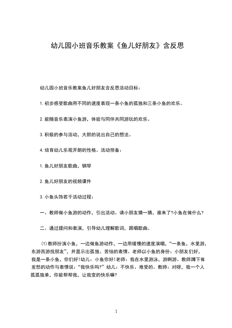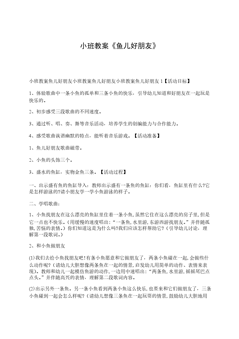 四、教师小结:教育幼儿在生活中多和好朋友一起玩。三条小鱼在一起玩耍多么快乐,我们小朋友之间也要相互团结,相互帮助,这样我们才会生活得很快乐。【活动延伸】让幼儿分组戴头饰表演歌曲。【设计意图】小班孩子年龄小,刚刚走进幼儿园这个陌生的环境,为了培养孩子乐于和同伴玩耍,进行团结友爱教育。我设计了鱼儿好朋友这个活动,让幼儿通过学习歌曲体验在音乐活动中与同伴游戏的快乐。学会交朋友,感受和朋友在一起的乐趣。教学反思:我针对小班幼儿的年龄特点和实际水平作了更变,我加了小鱼的头饰,配合歌曲清唱,将幼儿的情绪带入到歌曲中,并且深受感染,情不自禁地跟着我一起唱着曲调。在幼儿听了以后,一下子便能感受到小鱼在单独一人和与朋友在一起是不一样的情绪体验,有了朋友便很快乐。在表演的时候,幼儿由于经验不丰富,我便让幼儿模仿学习小鱼的动作、表情。在此基础上,还鼓励幼儿自己大胆做动作,用肢体语言感受到音乐的情绪和节奏。活动中孩子们的兴趣比较高昂,在说说、做做、唱唱的过程中,孩子们体验到了与同伴共同游戏的快乐。小百科;类是体被骨鳞、以鳃呼吸、通过尾部和躯干部的摆动以及鳍的协调作用游泳和凭上下颌摄食的变温水生脊椎动物,属于脊索动物门中的脊椎动物亚门,一般人们把脊椎动物分为鱼类(53%)、鸟类(18%)、爬行类(12%)、哺乳类(9%)、两栖类(8%)五大类。小班教案鱼儿好朋友2课前教材分析:新学期开始了,作为一名小班教师,如何稳定新入园幼儿的情绪,如何让孩子们爱上幼儿园、爱老师、爱同伴?这是我们必须首要思考和解决的问题。在与幼儿相处的这段日子里,我反复思考一个问题:为什么有的孩子还会苦恼不止呢?在观察和思考中,我找到了答案:主要原因是陌生环境没有同伴,离开亲人失去安全感,于是焦虑情绪油然而生,哭闹成了最好的发泄方式。这节鱼儿好朋友活动,节奏朗朗上口,歌词简单易学,活动中让孩子们进行简单的动作模仿学习,在音乐活动中体验与同伴游戏的快乐。活动目标: