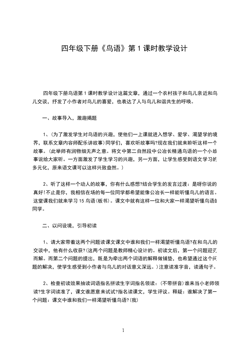 四年级下册鸟语第1课时教学设计这篇文章,通过一个农村孩子和鸟儿亲近和鸟儿交谈,抒发了小作者对鸟儿的喜爱,也表达了人与鸟儿和谐共生的呼唤。