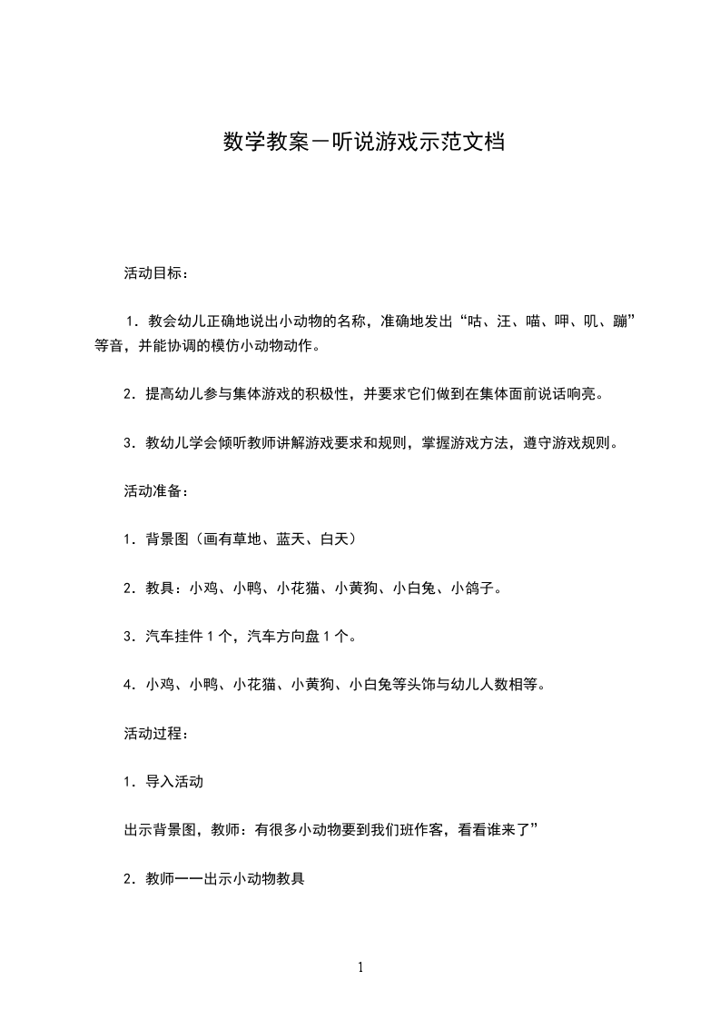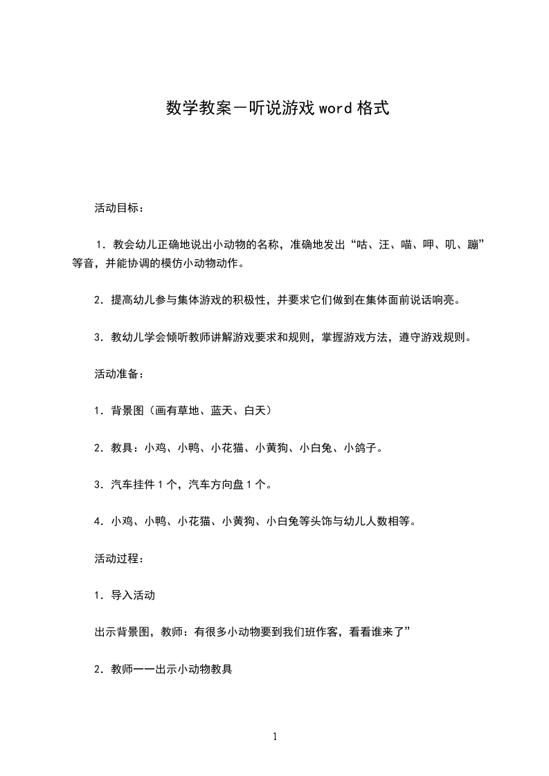 2、学生的经验准备:已经学过幼儿园听说游戏的概念、特点、类型、语言教育目标等