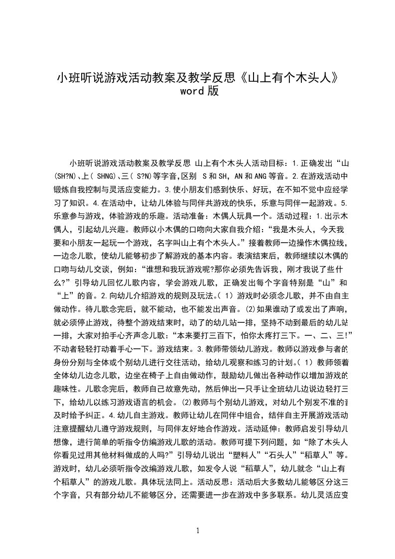 1、记住“山上有个木头人”的游戏儿歌,知道“山、上、三”的正确发音。