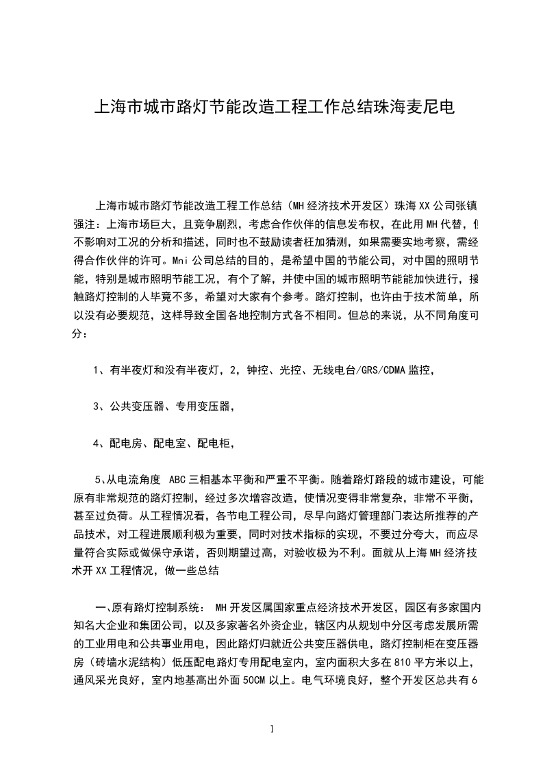 上海市城市路灯节能改造工程工作总结(MH经济技术开发区)珠海XX公司张镇强注:上海市场巨大,且竞争剧烈,考虑合作伙伴的信息发布权,在此用MH代替,但不影响对工况的分析和描述,同时也不鼓励读者枉加猜测,如果需要实地考察,需经得合作伙伴的许可。Mni公司总结的目的,是希望中国的节能公司,对中国的照明节能,特别是城市照明节能工况,有个了解,并使中国的城市照明节能能加快进行,接触路灯控制的人毕竟不多,希望对大家有个参考。路灯控制,也许由于技术简单,所以没有必要规范,这样导致全国各地控制方式各不相同。但总的来说,从不同角度可分: