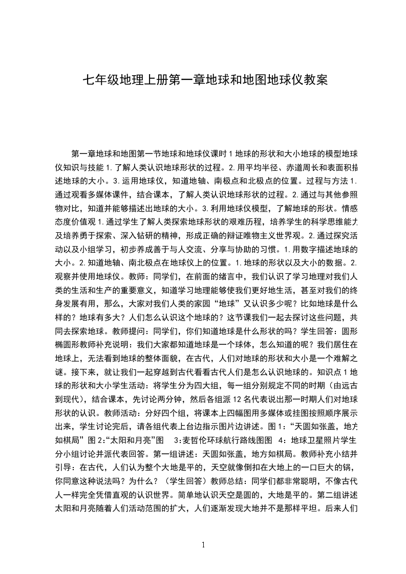 第一章地球和地图第一节地球和地球仪课时1地球的形状和大小地球的模型地球仪知识与技能1.了解人类认识地球形状的过程。2.用平均半径、赤道周长和表面积描述地球的大小。3.运用地球仪,知道地轴、南极点和北极点的位置。过程与方法1.通过观看多媒体课件,结合课本,了解人类认识地球形状的过程。2.通过与其他参照物对比,知道并能够描述出地球的大小。3.利用地球仪模型,了解地球的形状。情感态度价值观1.通过学生了解人类探索地球形状的艰难历程,培养学生的科学思维能力及培养勇于探索、深入钻研的精神,形成正确的辩证唯物主义世界观。2.通过探究活动以及小组学习,初步养成善于与人交流、分享与协助的习惯。1.用数字描述地球的大小。2.知道地轴、南北极点在地球仪上的位置。1.地球的形状以及大小的数据。2.观察并使用地球仪。教师:同学们,在前面的绪言中,我们认识了学习地理对我们人类的生活和生产的重要意义,知道学习地理能够使我们更好地生活,甚至对我们的终身发展有用,那么,大家对我们人类的家园“地球”又认识多少呢?比如地球是什么样的?地球有多大?人们怎么认识这个地球的?这节课我们一起去探讨这些问题,共同去探索地球。教师提问:同学们,你们知道地球是什么形状的吗?学生回答:圆形、椭圆形教师补充说明:我们大家都知道地球是一个球体,怎么知道的呢?我们居住在地球上,无法看到地球的整体面貌,在古代,人们对地球的形状和大小是一个难解之谜。接下来,就让我们一起穿越到古代看看古代人们是怎么认识地球的。知识点1地球的形状和大小学生活动:将学生分为四大组,每一组分别规定不同的时期(由远古到现代),结合课本,先讨论两分钟,然后各组派12名代表说出那一时期人们对地球形状的认识。教师活动:分好四个组,将课本上四幅图用多媒体或挂图按照顺序展示出来,学生讨论完后,请各组代表上台边指示图片边讲述。图1:“天圆如张盖,地方如棋局”图2:“太阳和月亮”图3:麦哲伦环球航行路线图图4:地球卫星照片学生分小组讨论并派代表回答。第一组讲述:天圆如张盖,地方如棋局。教师补充小结并引导:在古代,人们认为整个大地是平的,天空就像倒扣在大地上的一口巨大的锅,你同意这种说法吗?为什么?(学生回答)教师总结:同学们都非常聪明,不像古代人一样完全凭借直观的认识世界。简单地认识天空是圆的,大地是平的。第二组讲述太阳和月亮随着人们活动范围的扩大,人们逐渐发现大地并不是那样平坦。后来人们通过观察太阳和月亮的形状,并把他们作为参照物,推测地球也是个球体,于是就有了地球的概念。除此之外,他们还从生活中找到了一些例证,证明自己的推测,比如:海边远方驶过来的航船,先看见船桅,后见船身;食时,地球的影子边缘总是弧形的。教师引导提问:对于这样的说法,同学们能否提出质疑?(学生活动)教师总结:从海边看帆船到发生月食看到地球影子,人们对地球形状产生了极大的兴趣,并提出了地球可能是球体的假想。为了证实这样的假想,人类需要到地球的另一端去看看,为此,很多探险家进行了多次全球性的航行。你能说出历史上都有哪些著名的环球航行?(学生回答)教师讲述并引导:最著名的就是16世纪初葡萄牙航海家麦XX率领船队进行的环球探险航行。第三组同学代表回答学生讲述,麦XX船队环球航行的路线教师总结:麦XX的环球航行的巨大意义就是充分的证明了地球的形状是个球体。那么现在我们对地球形状的认识情况又是怎样的呢?请第四组的代表上来为我们讲述。第四组同学代表回答教师讲述:现在我们进入了太空可以在空中看到完整的地球并为地球拍了照片,确证地球是个球体。教师提问:刚才,我们四个组的同学把我们人类认识地球探索地球的过程给演示了一遍,从“天圆地方”到“天如斗笠,地如覆盘”,再从麦XX环球航行到地球卫星照片,人们对地球形状的认识经历了由简单认识到猜想到实践,由错误的现象到真理的漫长岁月,并付出了巨大的代价。从人类探索地球形状的过程中,同学们都有哪些感想?我们从中悟出了怎样的道理?(学生回答)教师总结:我们要学习先辈,对待任何事物要科学,要坚持严谨、认真的态度和为探索真理勇于奉献、不怕牺牲的精神。我们还要细心观察、勤于思考、善于总结、勇于实践,这样才能发现真理,取得成功。教师承转:我们认识了地球是球型的,那么她是不是真的是一个标准的球体呢?(可加入学生讨论)我们现在不仅认识了地球的形状,而且精确地测量出了地球的大小。一般来说,人们往往用表面积、周长、半径等数据来说明球体的大小。大家看到课本图12,说明地球究竟有多大?教师可用多媒体展示有关地球大小数据的图或挂图,然后让学生回答。(学生回答)教师讲述:精确的测量表明:从地心到北XX的半径为6357千米,赤道半径为6378千米。因此,准确地说,地球应该是两极稍扁,赤道稍鼓的球体。当然,这些差别同巨大的地球来比,还是微不足道的。例如:赤道半径只比北XX半径长21千米,如果把地球缩小成地球仪大小,这个差别就看不出来了。我们通常用平均半径来表示地球的大小,记住地球的平均半径是6371千米。板书:1.地球的形状:两极稍扁,赤道稍鼓的球体2.地球的大小:平均半径是6371千米思考:为什么说“坐地日行八万里”呢?启下;生活动:仔细观察