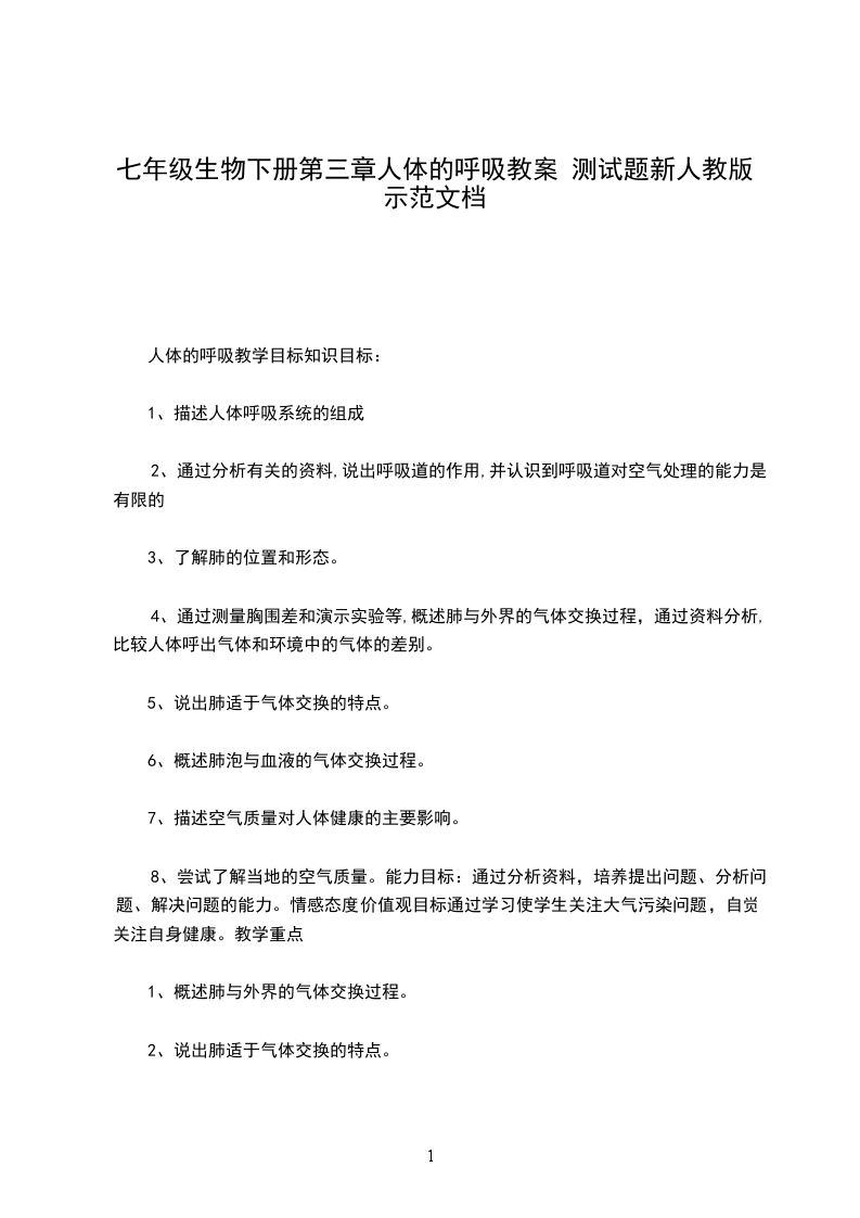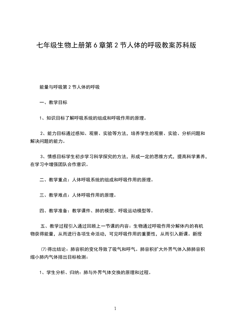 第七章第2节人体的呼吸案例背景教材分析本节内容描述人体呼吸系统的组成,概述人体肺部和组织细胞处的气体交换。对这部分内容学生有一定的认知基础,表现在两方面:一是知道人的生命与呼吸息息相关;是通过一些常见的呼吸系统各器官发生的疾病,大体知道呼吸系统的组成。但是呼吸器官究竟有哪些,这些器官对吸入气体有什么作用,了解的却比较少。学情分析对这部分内容学生有一定的认知基础,表现在两个方面:一是知道人的生命与呼吸息息相关;是通过一些常见的呼吸系统各器官发生的疾病,答题知道呼吸系统的组成。但是呼吸器官究竟是哪些,这些器官对吸入的气体有什么作用,了解的却比较少。教学目标知识技能()了