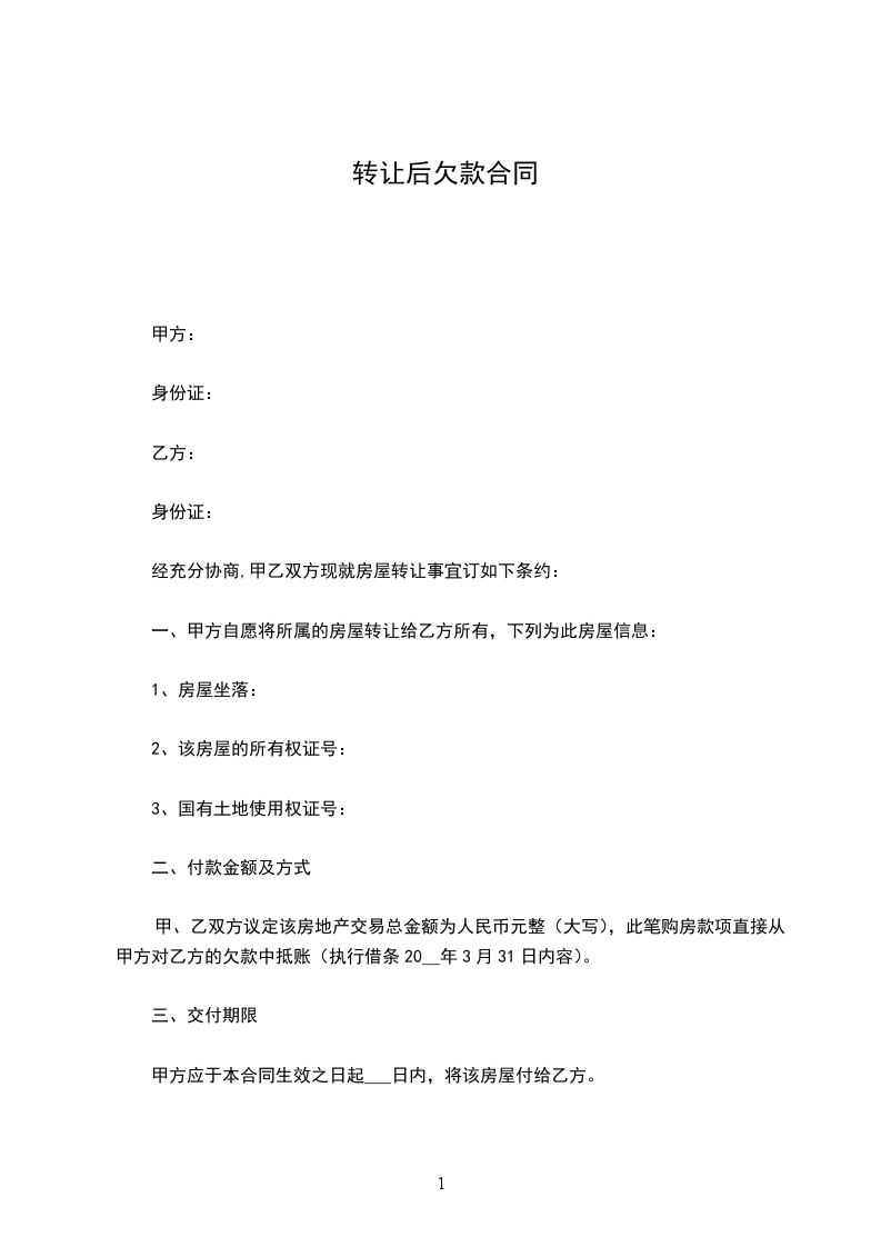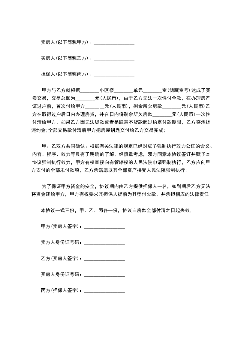 甲方与乙方就根据________小区楼________单元________室(储藏室号)达成了买卖交易,交易总额为________元(人民币),由于乙方无法一次性付全款,在办理房产证过户前,首次付给甲方________元(人民币),剩余所欠房款________元(人民币)乙方在取得过户后日内办理房贷,并在日内将剩余所欠房款________元(人民币)一次性付清给甲方,如果乙方因无法贷款或者是肆意不贷款超过约定付款期限,乙方将承担违约金;全部交易款付清后甲方把房屋钥匙交付给乙方交易完成;