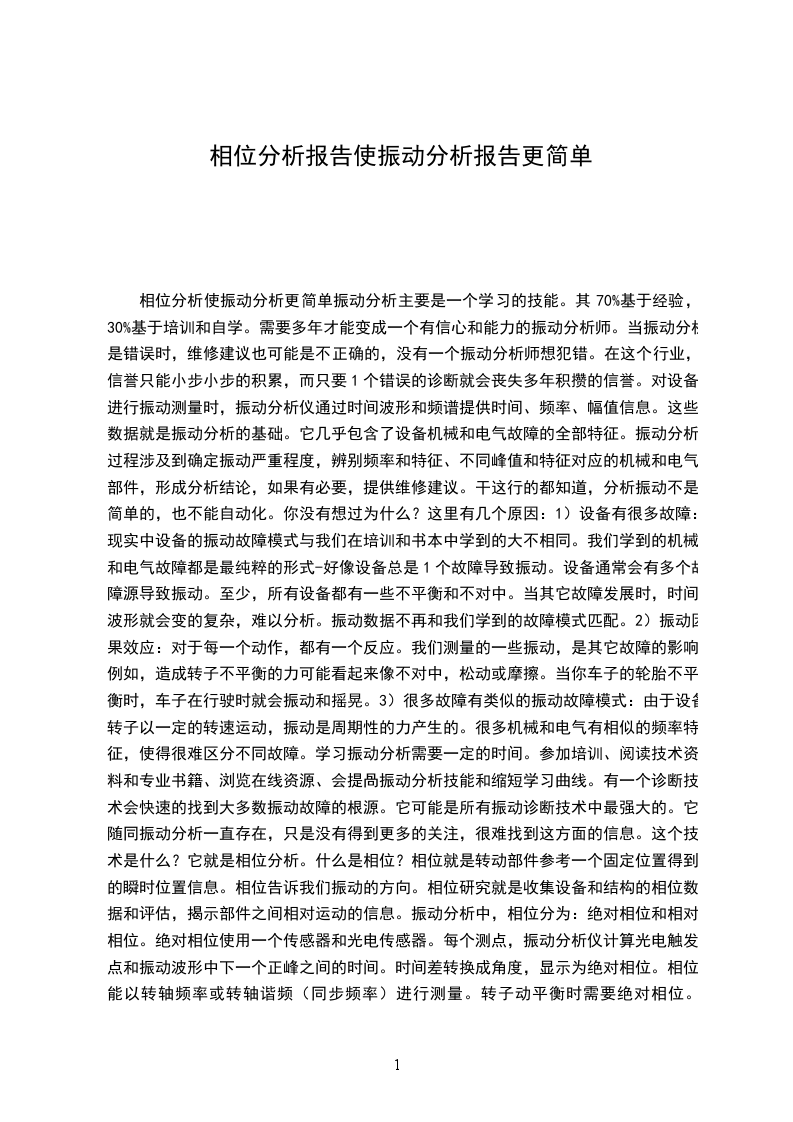 相位分析使振动分析更简单振动分析主要是一个学习的技能。其70%基于经验,30%基于培训和自学。需要多年才能变成一个有信心和能力的振动分析师。当振动分析是错误时,维修建议也可能是不正确的,没有一个振动分析师想犯错。在这个行业,信誉只能小步小步的积累,而只要1个错误的诊断就会丧失多年积攒的信誉。对设备进行振动测量时,振动分析仪通过时间波形和频谱提供时间、频率、幅值信息。这些数据就是振动分析的基础。它几乎包含了设备机械和电气故障的全部特征。振动分析过程涉及到确定振动严重程度,辨别频率和特征、不同峰值和特征对应的机械和电气部件,形成分析结论,如果有必要,提供维修建议。干这行的都知道,分析振动不是简单的,也不能自动化。你没有想过为什么?这里有几个原因:1)设备有很多故障:现实中设备的振动故障模式与我们在培训和书本中学到的大不相同。我们学到的机械和电气故障都是最纯粹的形式-好像设备总是1个故障导致振动。设备通常会有多个故障源导致振动。至少,所有设备都有一些不平衡和不对中。当其它故障发展时,时间波形就会变的复杂,难以分析。振动数据不再和我们学到的故障模式匹配。2)振动因果效应:对于每一个动作,都有一个反应。我们测量的一些振动,是其它故障的影响。例如,造成转子不平衡的力可能看起来像不对中,松动或摩擦。当你车子的轮胎不平衡时,车子在行驶时就会振动和摇晃。3)很多故障有类似的振动故障模式:由于设备转子以一定的转速运动,振动是周期性的力产生的。很多机械和电气有相似的频率特征,使得很难区分不同故障。学习振动分析需要一定的时间。参加培训、阅读技术资料和专业书籍、浏览在线资源、会提咼振动分析技能和缩短学习曲线。有一个诊断技术会快速的找到大多数振动故障的根源。它可能是所有振动诊断技术中最强大的。它随同振动分析一直存在,只是没有得到更多的关注,很难找到这方面的信息。这个技术是什么?它就是相位分析。什么是相位?相位就是转动部件参考一个固定位置得到的瞬时位置信息。相位告诉我们振动的方向。相位研究就是收集设备和结构的相位数据和评估,揭示部件之间相对运动的信息。振动分析中,相位分为:绝对相位和相对相位。绝对相位使用一个传感器和光电传感器。每个测点,振动分析仪计算光电触发点和振动波形中下一个正峰之间的时间。时间差转换成角度,显示为绝对相位。相位能以转轴频率或转轴谐频(同步频率)进行测量。转子动平衡时需要绝对相位。XXX:XXX層tachsignalandvibrationwaveform.相对相位通过多通道振动分析仪同时使用两个或多个同样类型的传感器采集交叉通道的振动波形计算得到的。1个传感器作为固定参考放置在设备上(通常是轴承座),另一个传感器移动到不同的测点。在每个测点,振动分析仪比较固定传感器和移动传感器之间的时间波形。相对相位就是特定频率时间波形的时间差,转换为角度。相对相位不需要光电传感器,所以在任何频率测量相位。XXX.RelativehaseCalculatedBetweenTwoVibrationWaveformsFi_dVibrationSensorWaveformRovingVibrationSense_Waveform两种相位测量方法都很简单。相对相位是比较方便的一种方法,因为不用停机安装反光带,且可以在任何频率测量。大多数单通道振动分析仪可以测量绝对相位,市面上大多数多通道振动分析仪包含绝对相位和相对相位两种测量功能。什么时候使用相位分析每个人都需要相位分析。当设备的振动故障源不清楚或需要确定可疑的振动源时,就需要使用相位分析。相位分析测点可能只包括设备轴承部位或包括整个设备从地基到轴承。软脚软脚用来描述机组框架变形。电机地脚,机泵和其它部件不平,其它问题,如加工误差,地脚弯曲或扭曲,安装平面不平等都会造成软脚。软脚会加剧振动和对轴承、密封、联轴器施加过度应力。软脚会造成电机定子基座变形,造成气隙不均,导致2_线频的振动。使用激光对中仪,逐次松动设备的地脚,矫正软脚。当设备运转时,相位用来确认软脚。测量地脚安装平面和地脚的垂直相位。如果连接是紧的,两者相位相同。如果相位差超过20度,地脚是松动的或机组的框架断裂或不稳。XXX.轴承翘曲和轴弯曲相位可用来检测轴承翘曲和轴弯曲。测量轴承座轴向4个位置的相位如果轴承是翘曲或转轴弯曲,每个方向的相位都不相同。如果转轴是直的,轴承没有翘曲,每个方向的相位是相同的。不平衡确认1_转频通常以为转子不平衡,可以使用相位确认不平衡。测量轴承座垂直方向和水平方向上的相位,如果相位差约为90度,故障是不平衡。如果相位差接近0度或180度,这是有反映力引起的振动。偏心的带轮和轴不中都是反映力。松动,弯曲或扭曲相位可以用来检测结构松动和由刚度弱或共振造成的弯曲和扭曲。测量每个连接点的垂直相位如图11,如果连接点松动,相位差会是180度。连接紧的,相位不会变化。XXX.轴不对中使用相位可以轻松的确认转轴不对中。对每个轴承的垂直,水平,轴向进行测量,记录相位和振动。对各个测点的水平方向、垂直方向、轴向数据进行对比。如果联轴器两侧测点相位接近,对中良好。图12中,径向方向联轴器两侧测点相位差180度,轴向方向相同。数据说明是转轴平行不对中。andMagnitudeBubbEeDiagnamtoilerFeedum3580rmReadingsinVetocily,XX